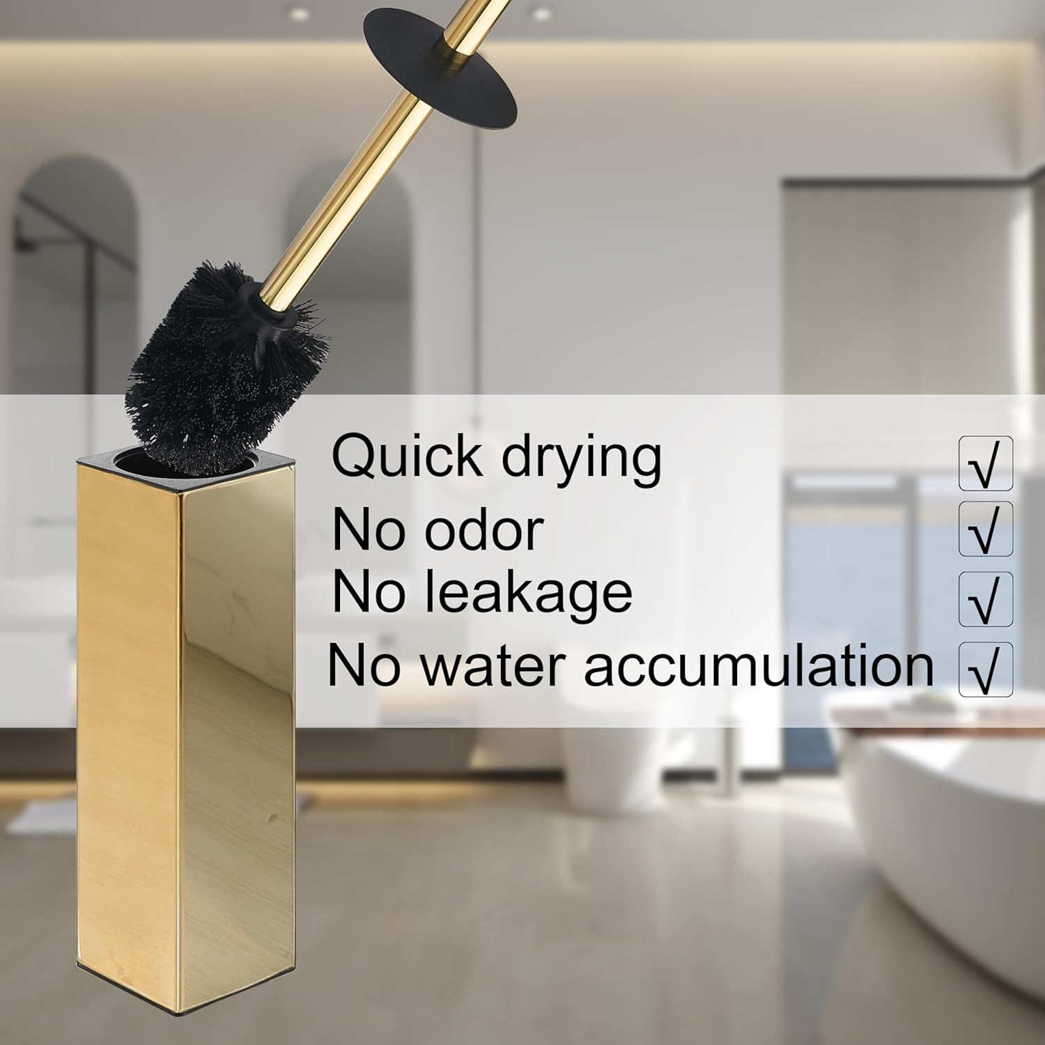 BGL Square Toilet Brush with Holder,Stainless Steel Rubber Painted Toilet Bowl Brush and Holder for Bathroom,2 Cleaner Brush Heads,Gold