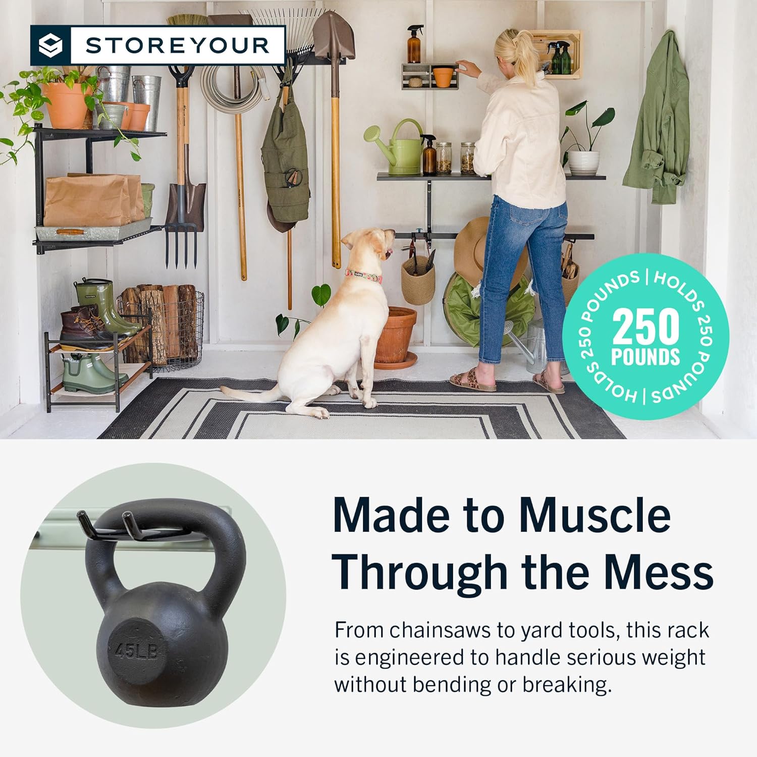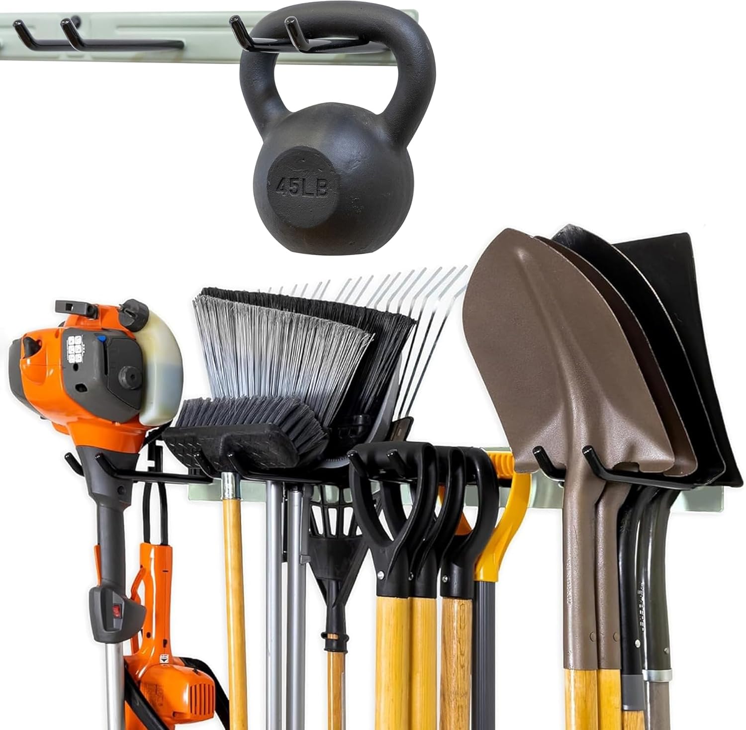 • RECLAIM YOUR GARAGE – Conquer clutter with this garden tool organizer designed for garage storage, sheds, or workshops. Measuring 36" L x 9.5" W x 2.5" H, it features four PVC-coated garage hooks and a 250 lb weight capacity, ideal for storing shovels, brooms, rakes, and power tools. Installs with 3 heavy-duty lag screws directly into 16" wall studs for secure, long-lasting support.