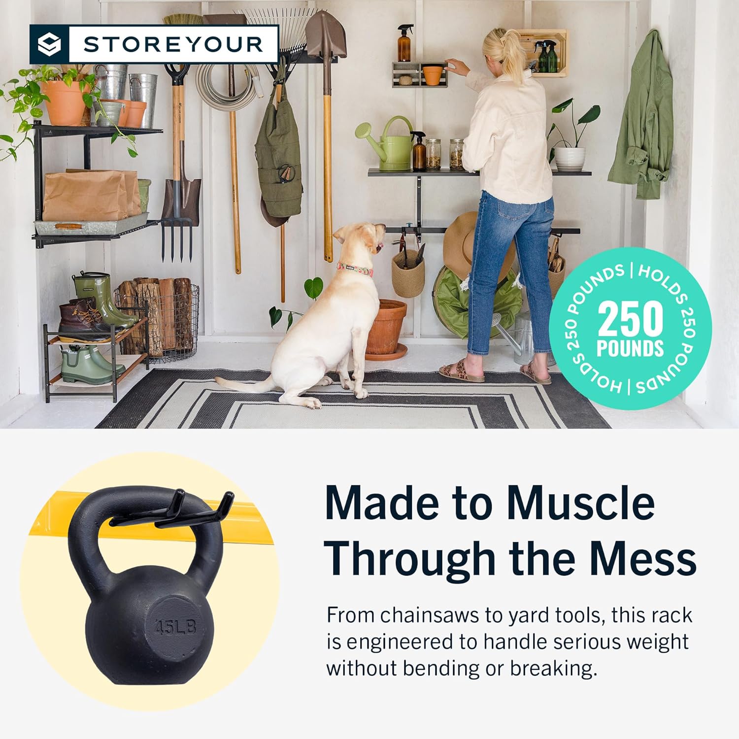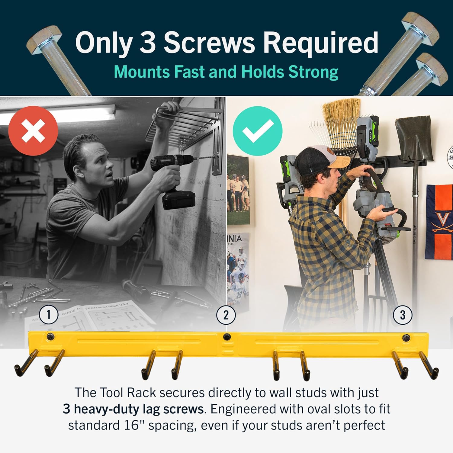 • RECLAIM YOUR GARAGE – Conquer clutter with this garden tool organizer designed for garage storage, sheds, or workshops. Measuring 36" L x 9.5" W x 2.5" H, it features four PVC-coated garage hooks and a 250 lb weight capacity, ideal for storing shovels, brooms, rakes, and power tools. Installs with 3 heavy-duty lag screws directly into 16" wall studs for secure, long-lasting support.