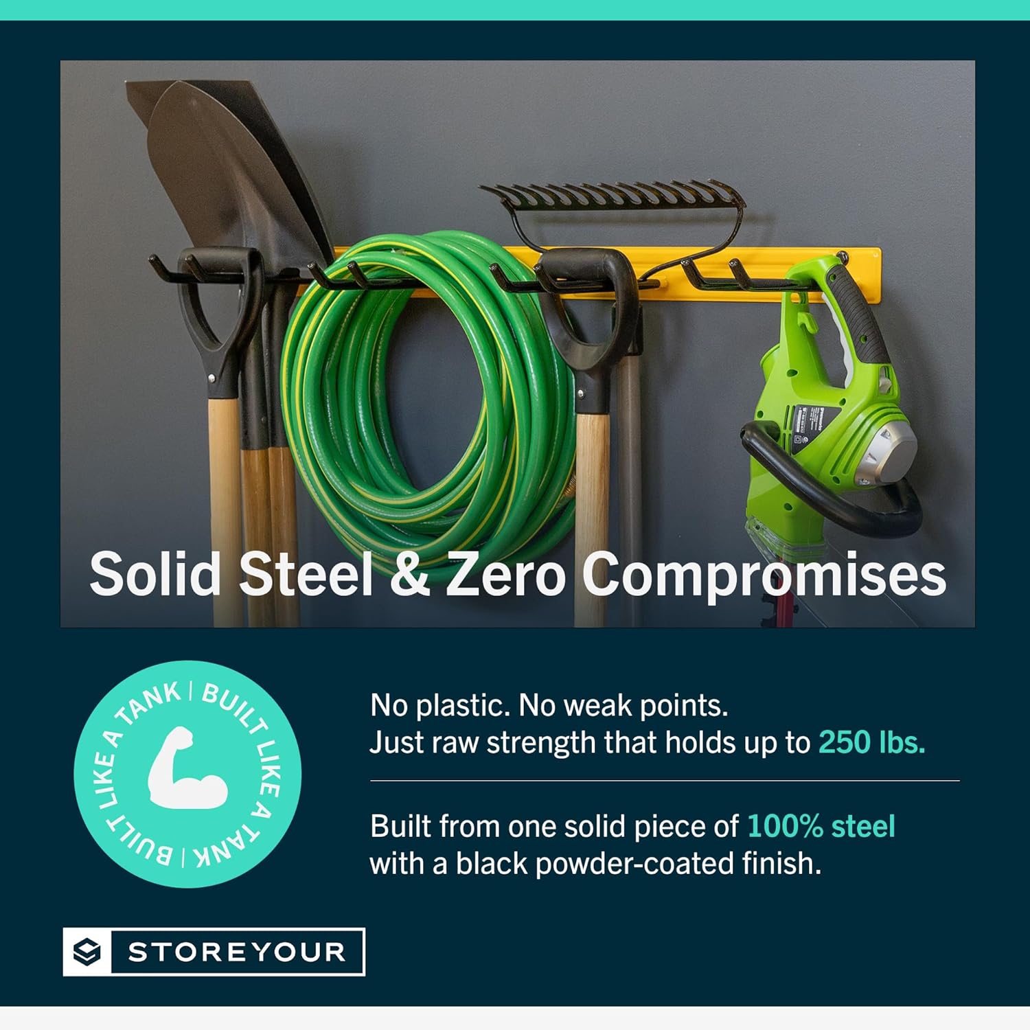 StoreYourBoard Wall-Mounted Rack With 4 Garage Hooks – Heavy-Duty Steel Holder Garage & Garden Storage for Shed, Workshop, or Home Organization – For Rakes, Shovels, Tools & More – 1 Pack, Tractor