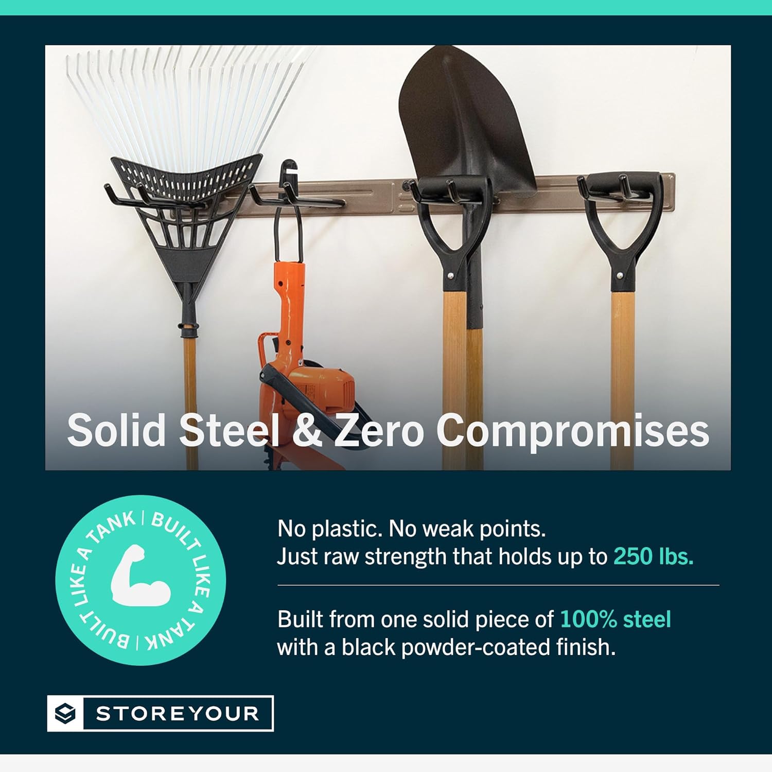 • ULTRA-STRONG & BUILT TO LAST – Made from 100% solid steel with no plastic parts or assembly required, this tool rack is crafted to withstand heavy-duty use. Each wall-mounted storage rack arrives fully welded and powder-coated to resist rust and corrosion. Perfect for organizing tools, outdoor storage gear, or even a fishing pole rack for the garage.