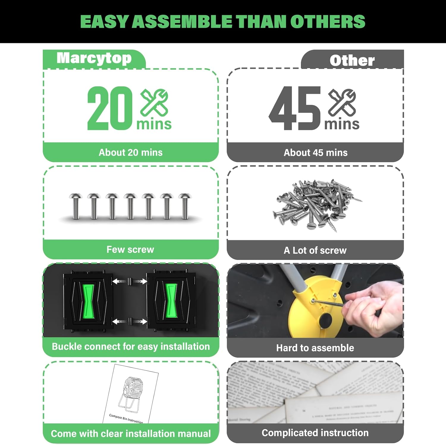• Easy Assembly: Comes with all the necessary accessories and clear instructions to help you quickly and easily complete the assembly process. The Compost Tumbler is connected using buckles and fewer screws, ensuring a convenient and efficient installation. (About 30 minutes)