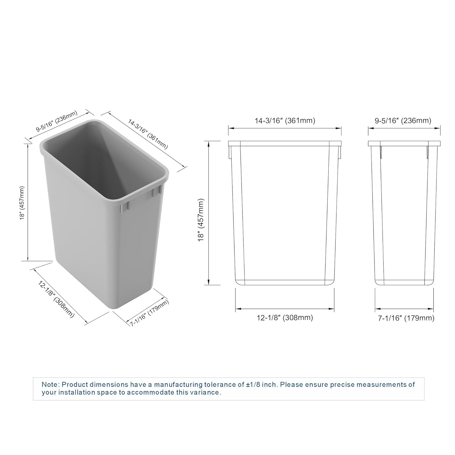 • Dowell 35L Wastebasket Trash Container Dimensions (W x D x H): 14.19"W x 9.31"D x 18"H; Bottom/Base Dimensions (W x D): 12.13"W x 7.06"D
