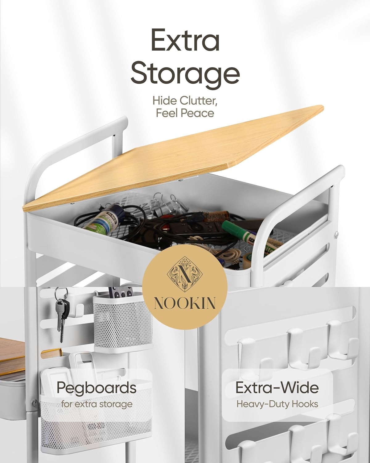Art Cart with Tabletop & Pegboard - 3-Tier Rolling Utility Cart with Wheels, 2 Baskets & 6 Hooks - Metal Storage Organizer for Home, Office, Crafting & Kids’ Art Supplies (White)