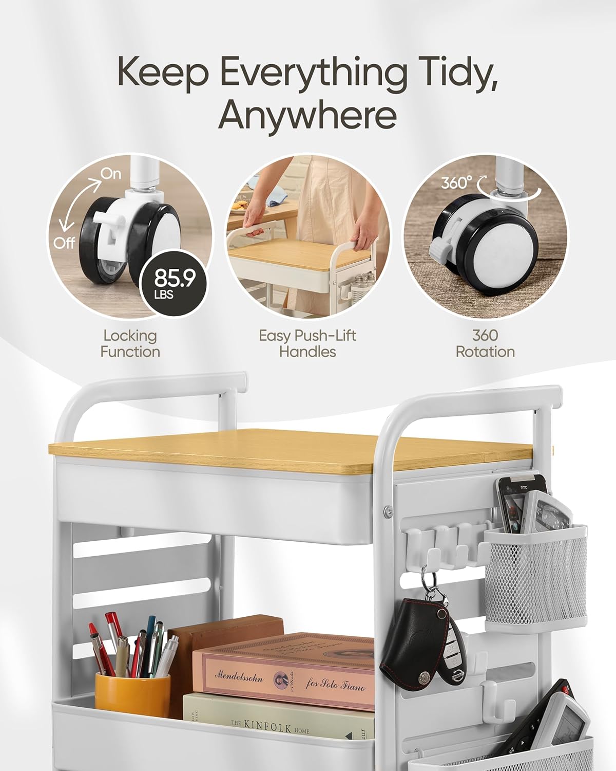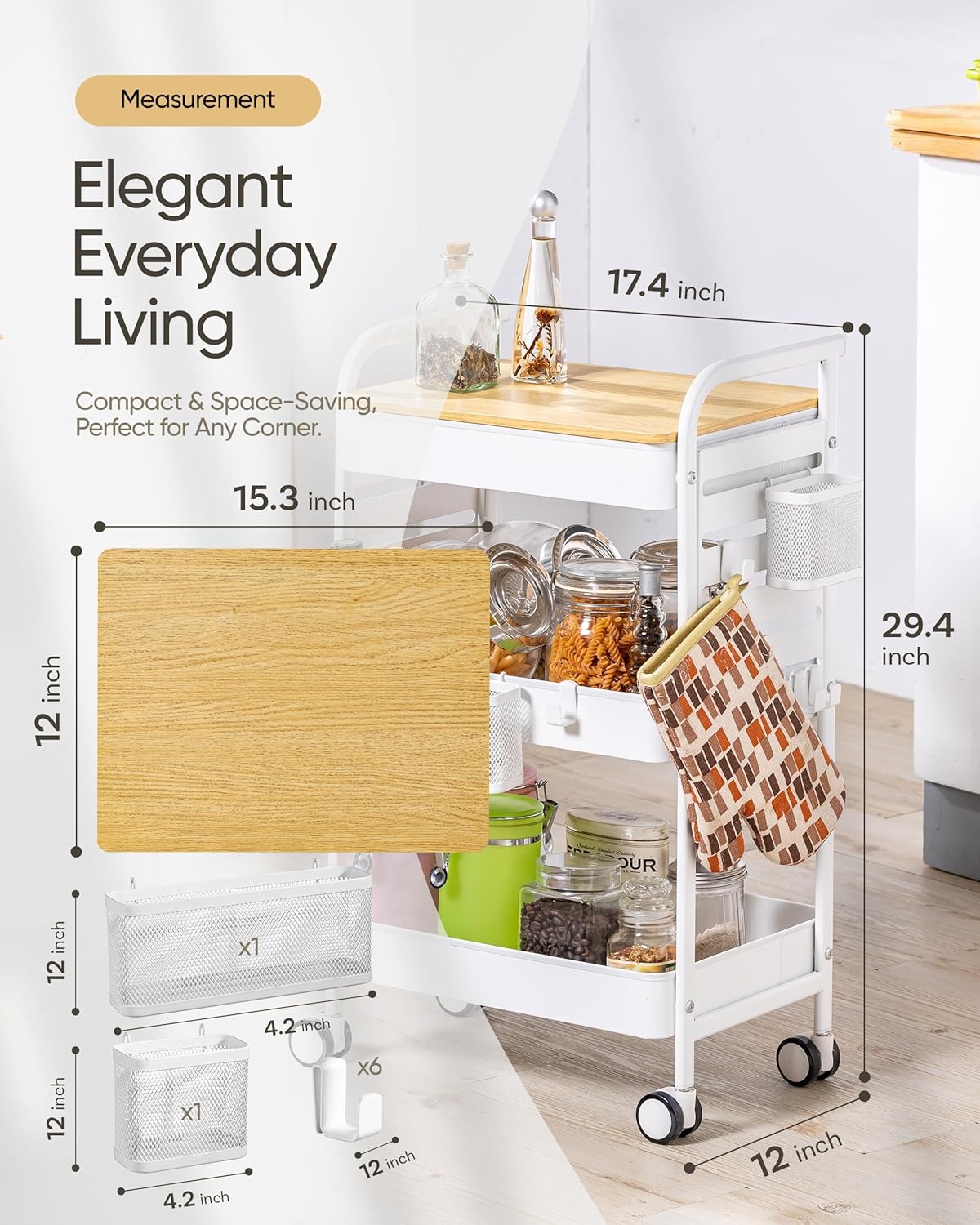 • 🎁【Bonus Accessories for Maximum Convenience】 Enjoy $20 worth of bonus accessories! This cart includes 6 heavy-duty hooks, perfect for hanging kitchen utensils, office supplies, or craft tools. Plus, 2 spacious mesh baskets allow for quick & easy access, ensuring everything stays within reach.