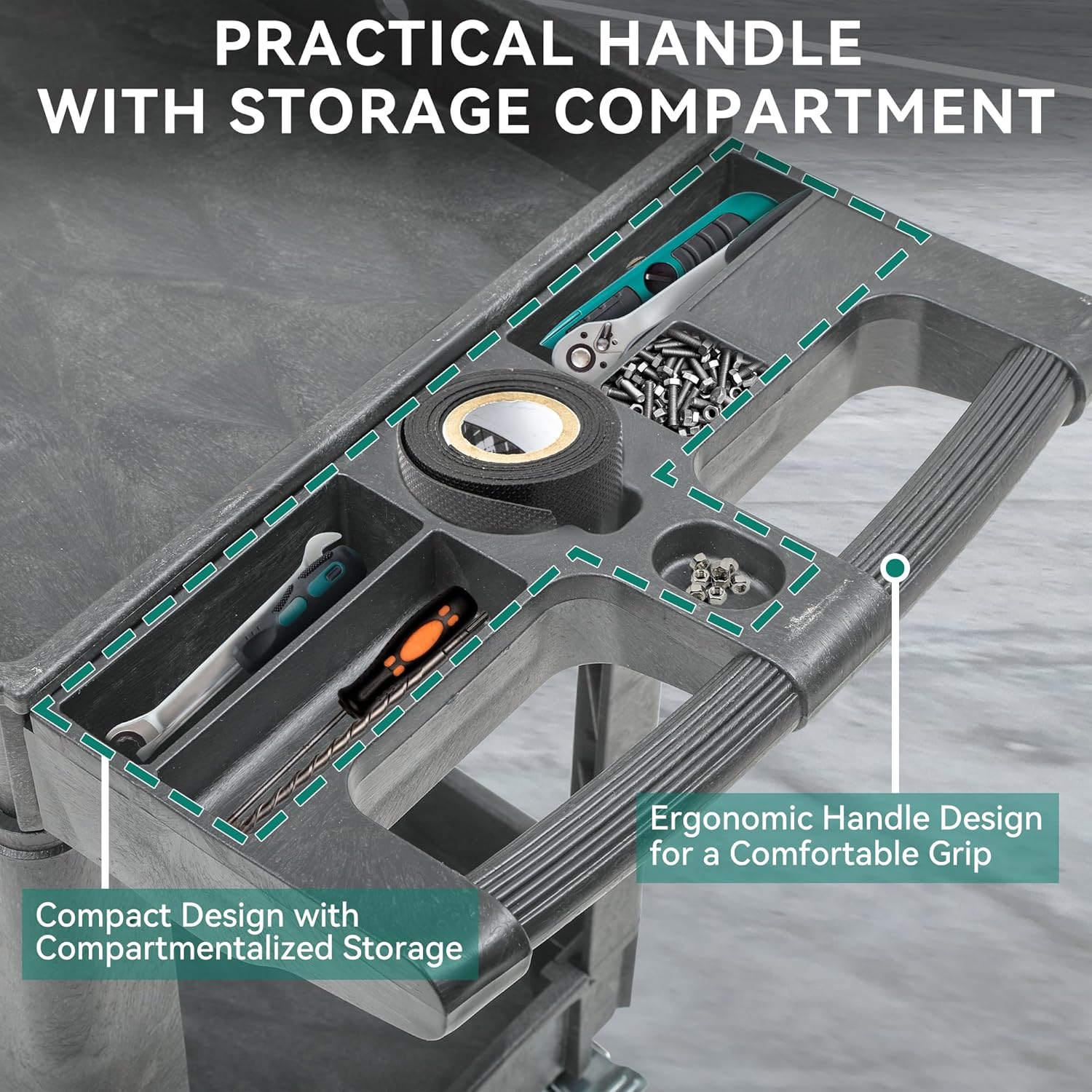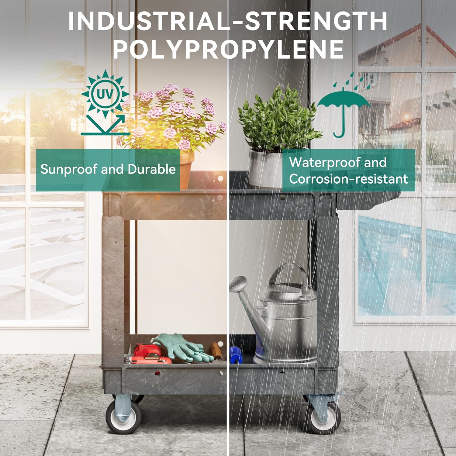 • RAIN & SUN PROTECTION: The plastic utility carts are made of rainproof material with a protective coating that protects the cart from rain and sun. Whether indoors or outdoors, the cart will not deform. This rolling work carts with wheels is also designed with round corners for safety of user, furnitures and walls.