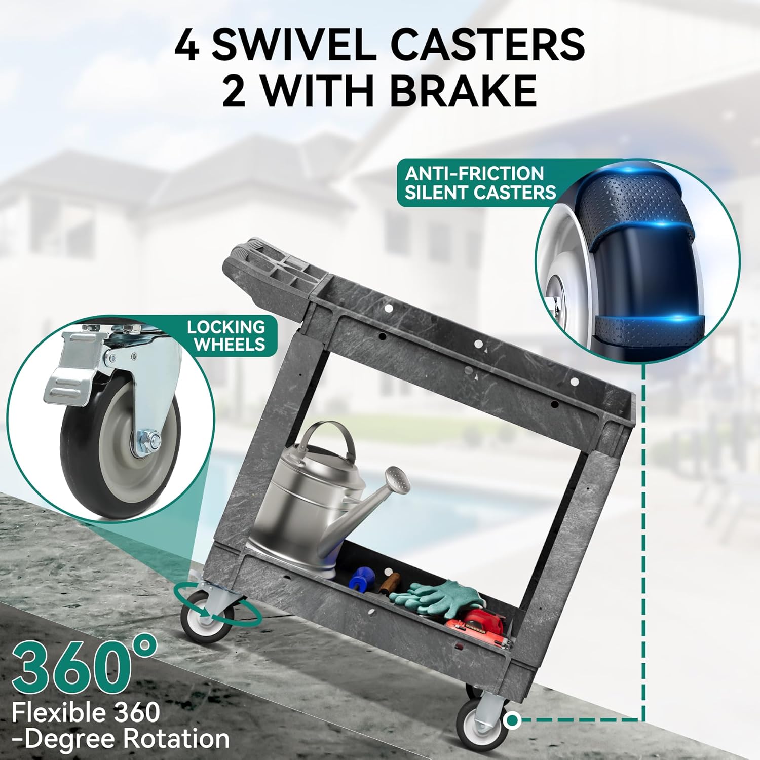 YITAHOME Utility Cart on Wheels, 550 lbs Capacity Service Cart, 40 x 17 Inch Rolling Work Carts, 2 Shelf Heavy Duty Plastic Cart Suitable for Warehouse, Garage, School & Office, Cleaning, Gray