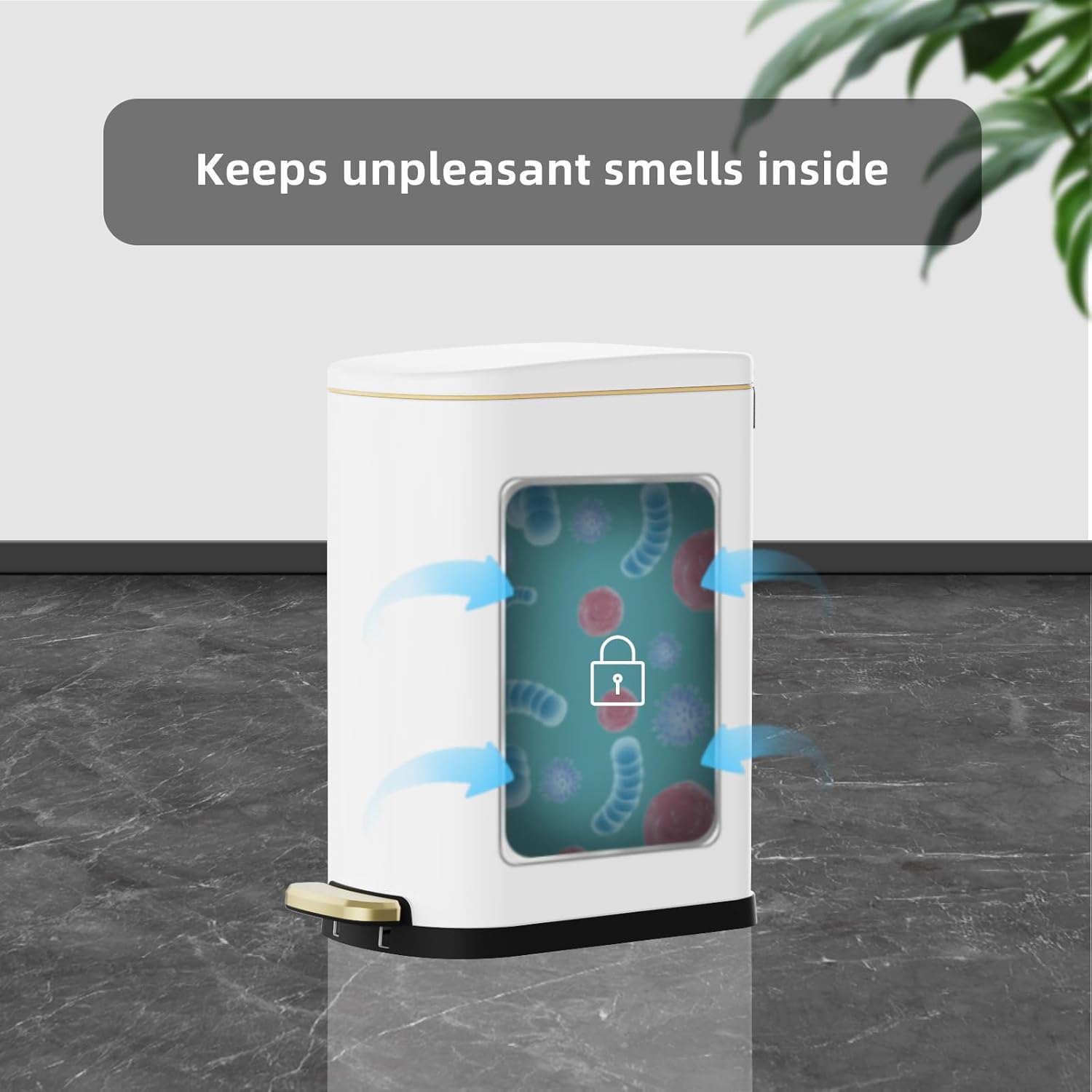 • 【COMPACT DESIGN】This 2.6 gallon step trash can is slim design, only 6.5 inch wide, the rectangular shape is the perfect size for inside cabinets, under counters, under sinks and other small spaces.