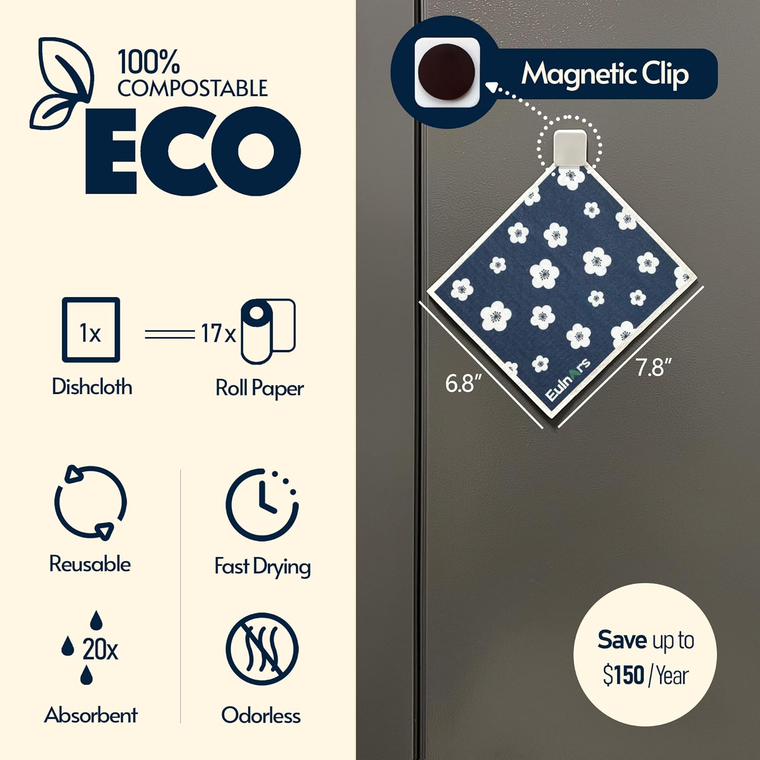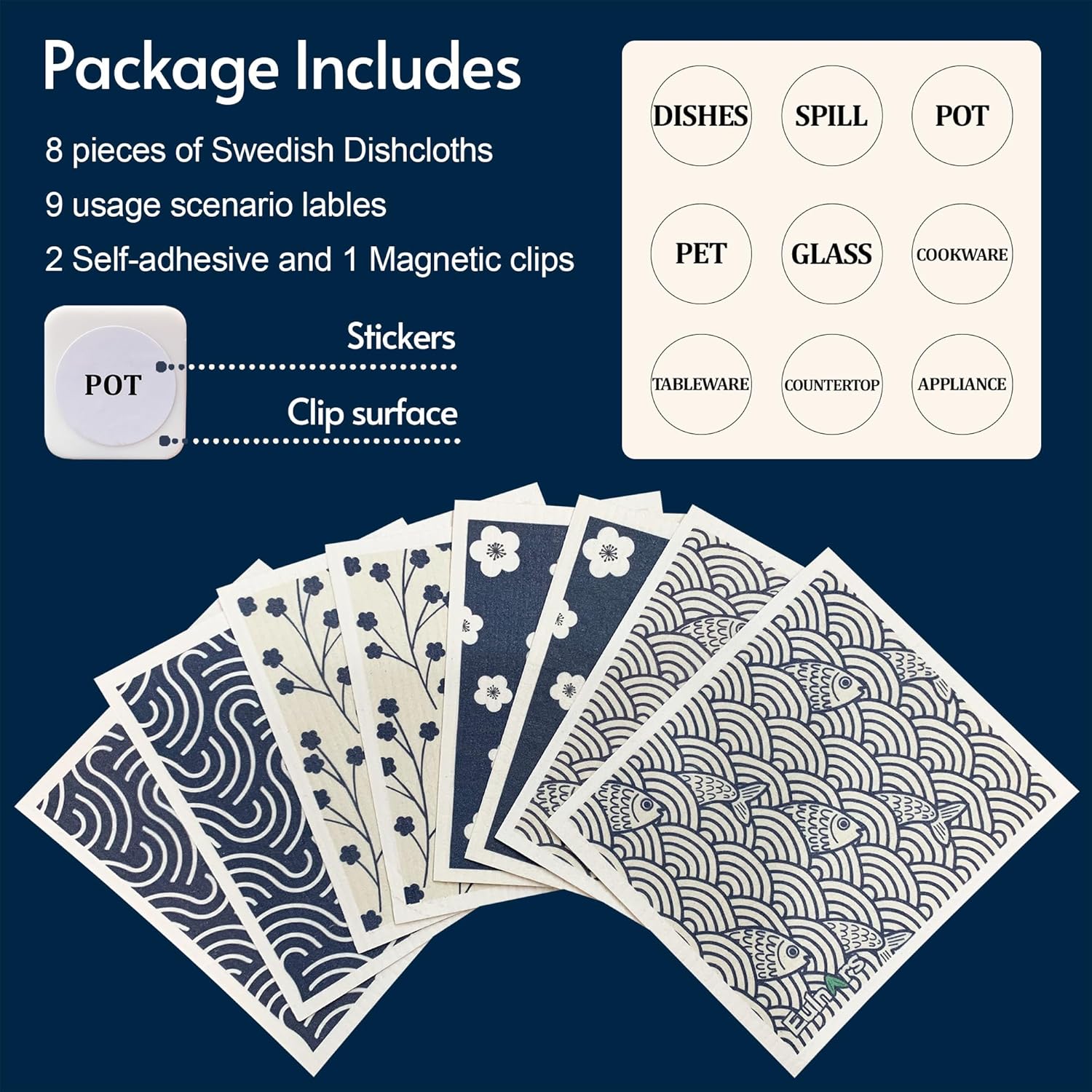 • Easy to Clean and Store: Our swedish dish cloths, measuring 7.8 x 6.8 inches, each set comes with 8 dish cloths in 4 styles, along with 2 self-adhesive clips, 1 magnetic clip, and 9 labeling tags. Customize storage for easy access, hanging them on walls, counters, or refrigerators to keep your kitchen organized