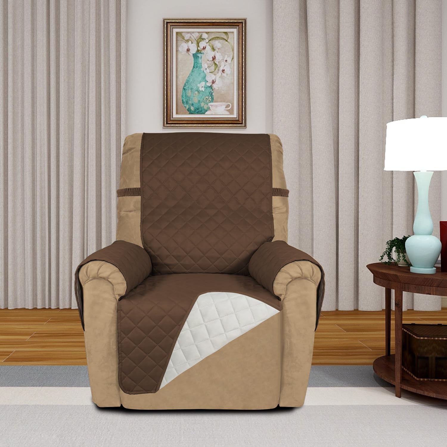 PureFit Reversible Quilted Sofa Cover, Water Resistant Slipcover Furniture Protector, Washable Couch Cover with Non Slip and Elastic Straps for Kids, Dogs, Pets (Recliner, Coffee/Ivory)