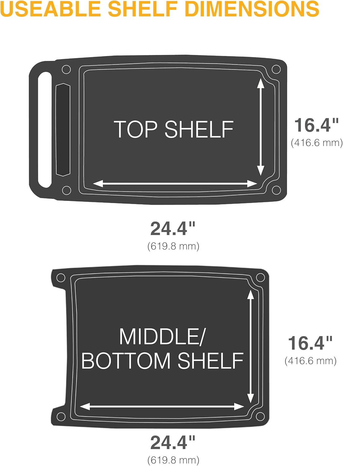 • Built to Handle the Toughest Loads: Triple your storage solutions with this 3-shelf cart. With a maximum weight capacity of 400 lbs (181 kg), this cart allows you to conquer even the most demanding storage challenges. Each shelf can handle up to 150 lbs (68 kg) of tools, supplies, or equipment, keeping everything organized and readily accessible.