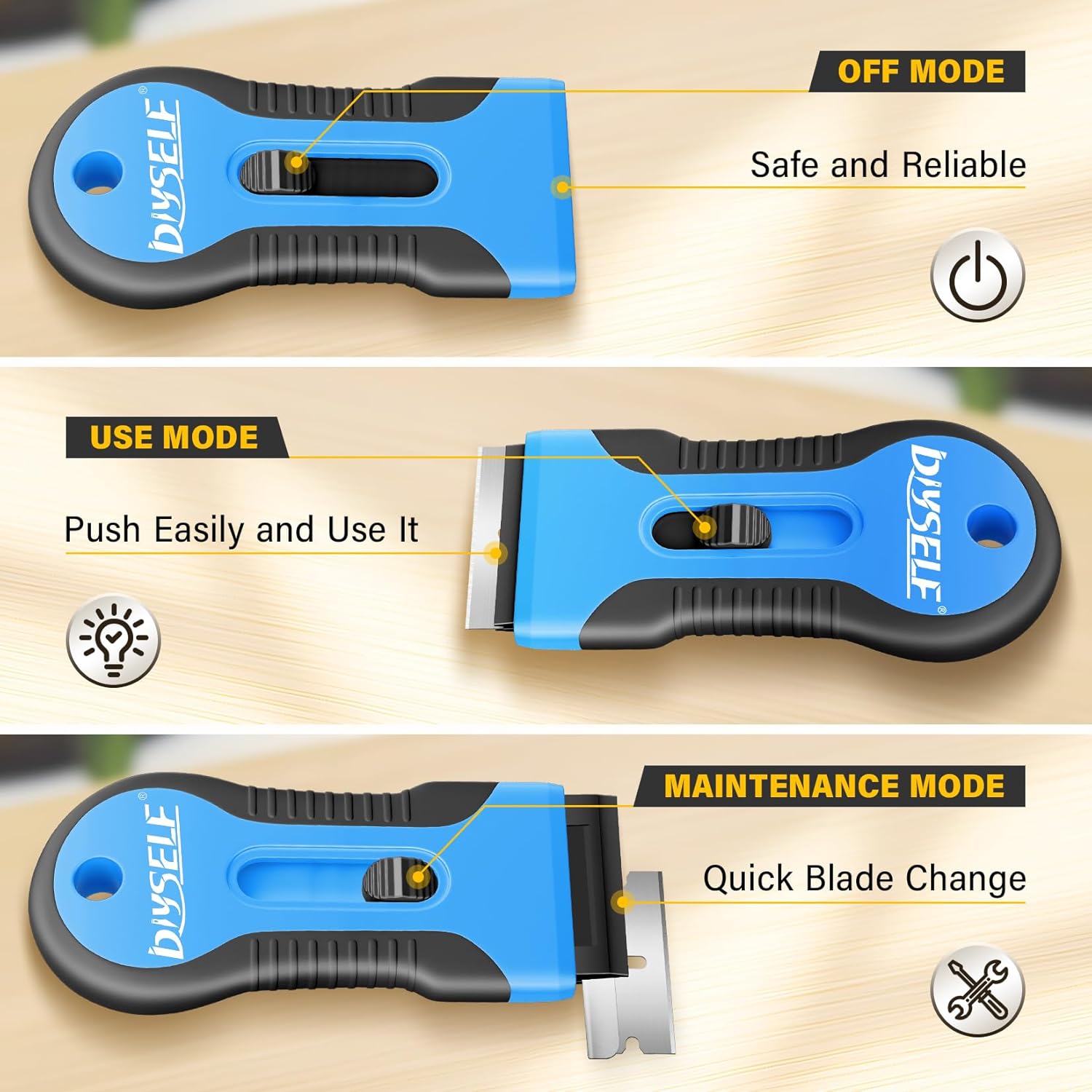 • High-Quality Blades and Professional Structural Design: This razor blade scraper features high-quality carbon steel blades and a three-stage adjustment mechanism. The initial position securely locks the blade inside for safety. Pushing the button forward extends the blade for use, while further advancing it exposes the blade holder for quick replacement. This razor scraper is designed for professional tasks and includes 10 replacement blades to ensure a plentiful supply.