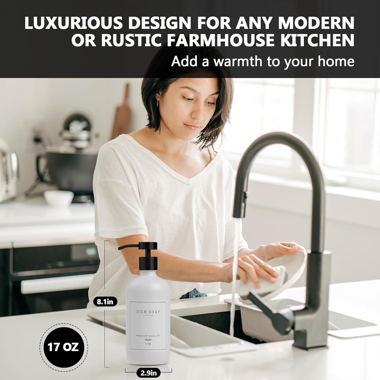 • COMFORTABLE AND DURABLE: Our dish soap dispenser for kitchen use the well-designed corrosion-resistant soap dispenser pump is not only beautiful, but also resistant to daily wear and tear, and every press is smooth and natural and releases the right amount of soap, avoiding waste, reducing hand fatigue, making even long cleaning jobs easy and enjoyable