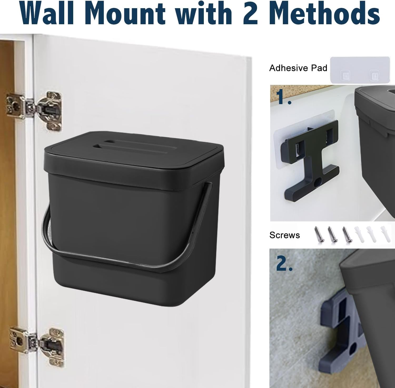 • Wall Mount/Under Sink/Hanging Trash Bin: The compost bucket can be easily hung on kitchen cabinet doors, pantry doors. (The thickness of the door should be less than 0.86 inch) Moreover, this small plastic trash bin also be wall-mounted to under sinks, cupboard, kitchen wall with adhesive pad or screws.