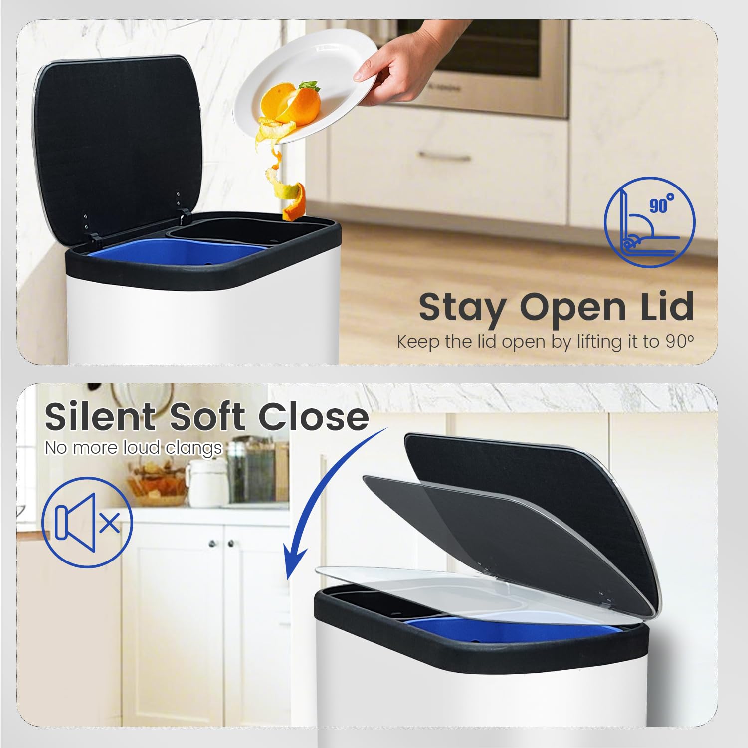 • What You Get: A dual trash can sized at 22.05”L x 16.54”W x 26.57”H with 2 x 8-gallon compartments, plastic inner buckets, and a soft closure mechanism for easy waste disposal.