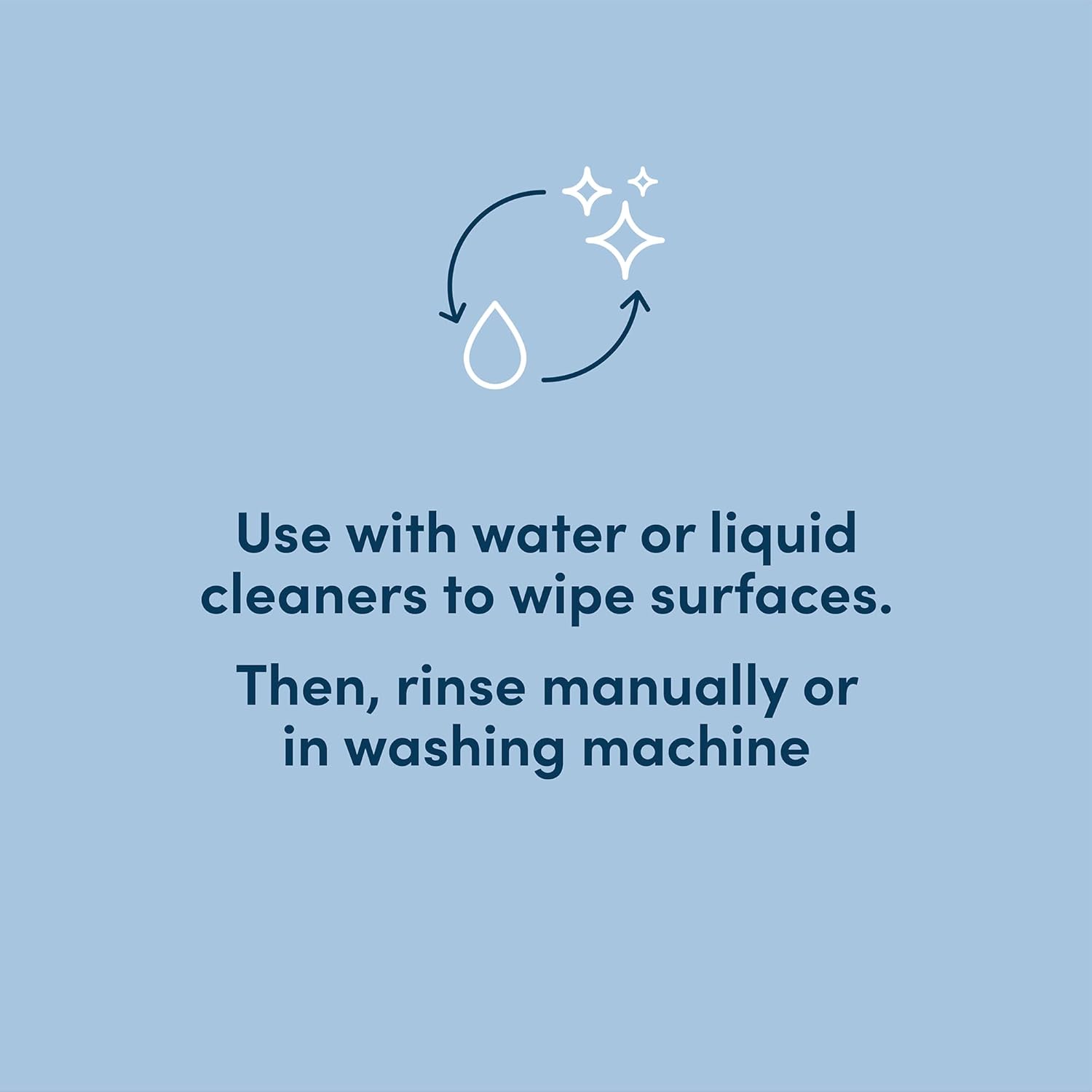 • Use with water or liquid cleaners to wipe surfaces. Rinse manually or in washing machine