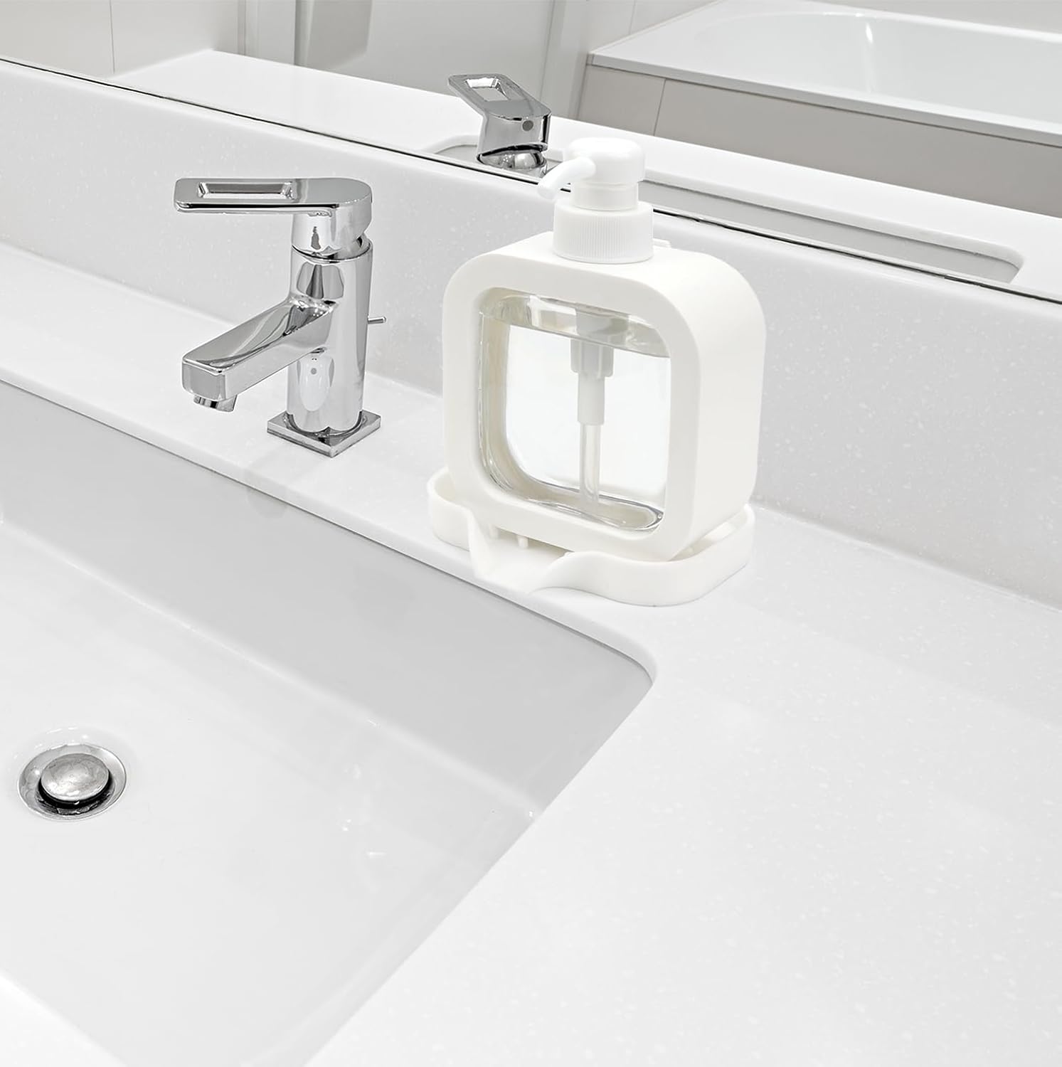 • ★Safe, Easy to Clean, Easy to Store: The soap dispenser tray is made from premium food grade silicone, so it’s safe for use in the kitchen or bathroom. The smooth surface of the soap dish makes it easy to clean, you can simply rinse or brush it with water, and it’s dishwasher safe. And its compact size makes it easy to store when not in use.