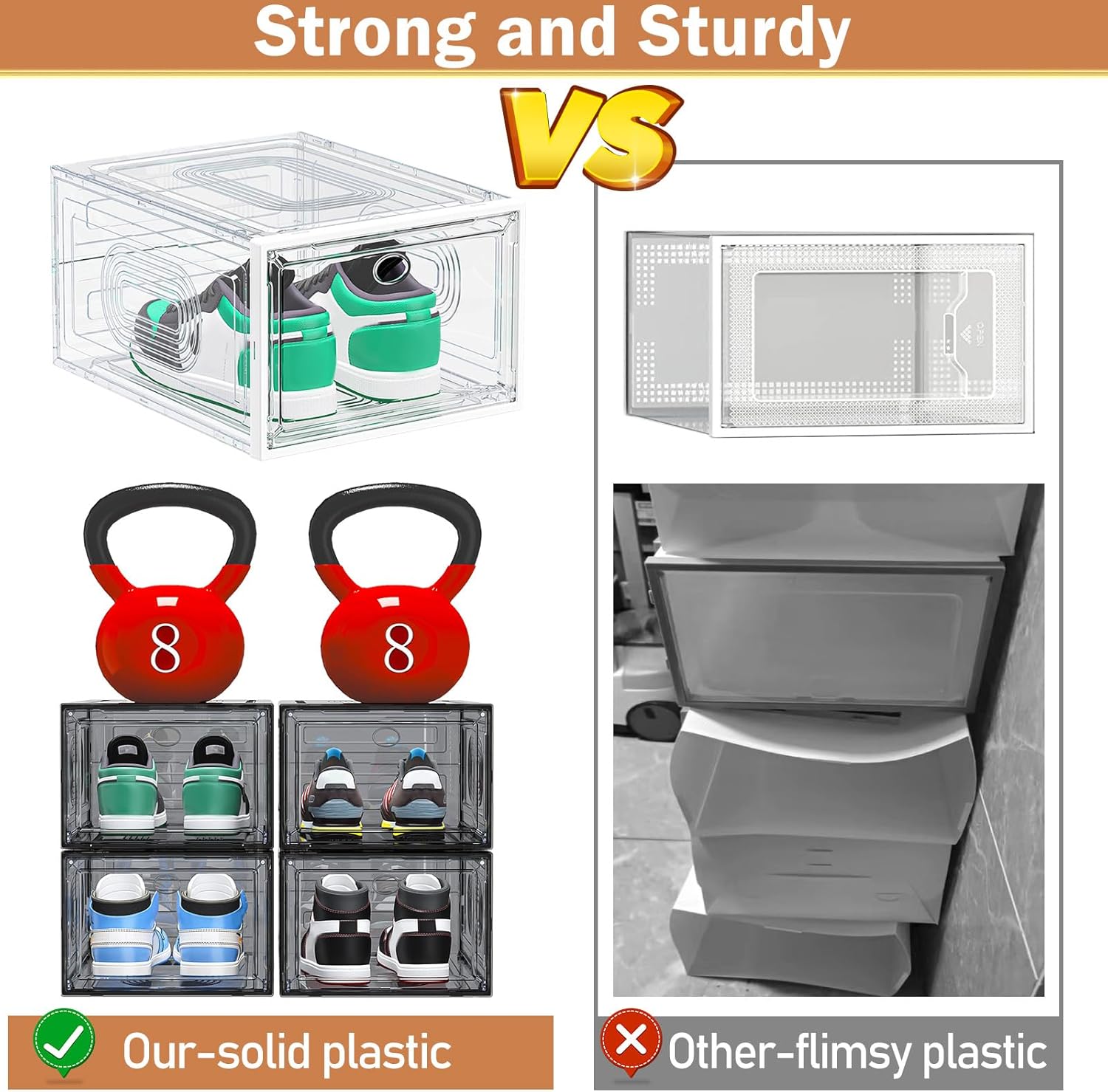 • 【Clear Shoe Box Stackable】Clear magnetic front door, stackable design, harder material, the shoe storage organizer provide you a more load-bearing multiple layers of shoe walls.You can find out the shoes with a glance over the boxes without open the boxes