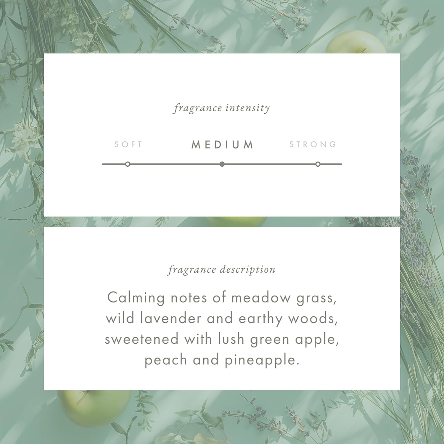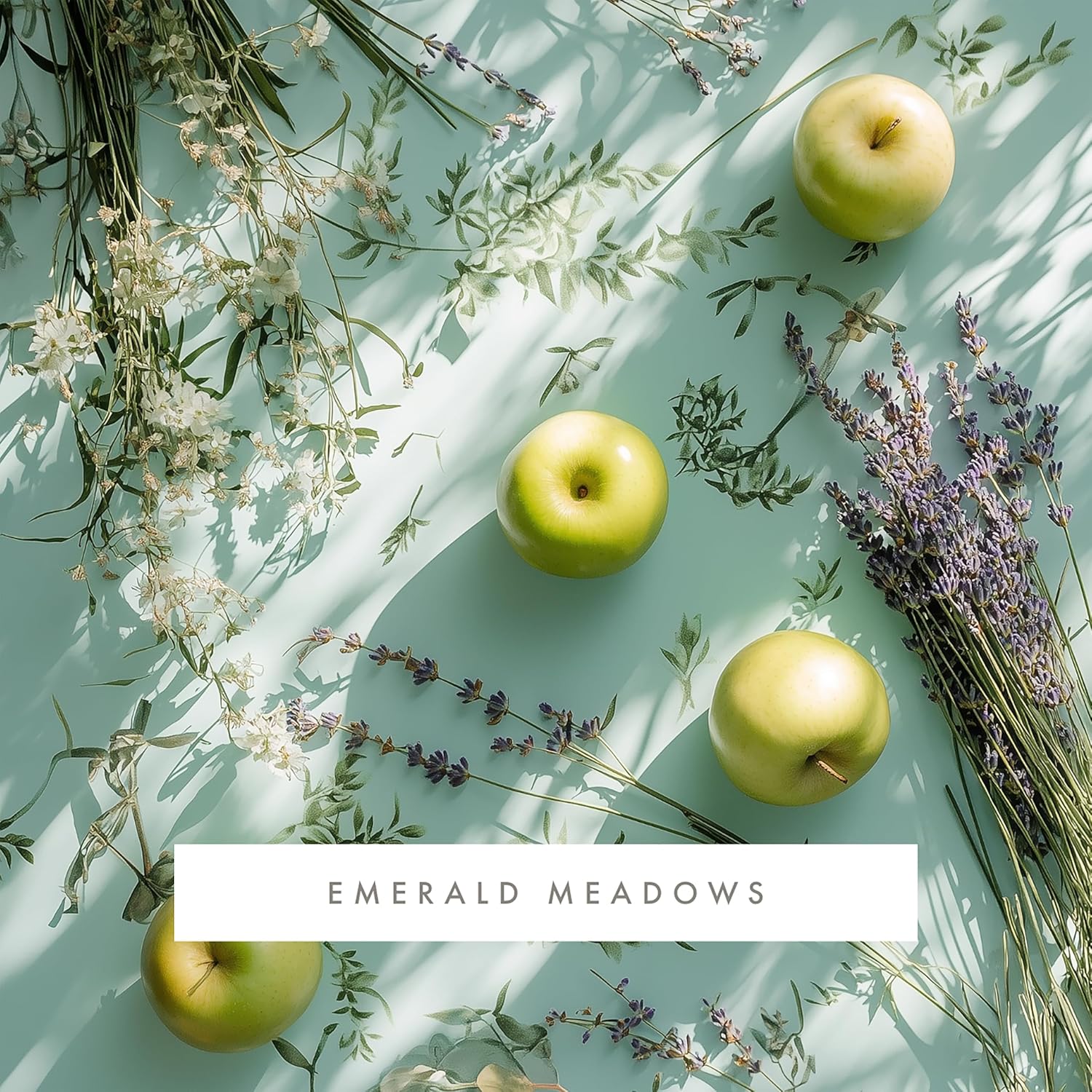 • EMERALD MEADOWS: Calming notes of meadow grass, wild lavender, and earthy woods, sweetened with lush green apple, peach, and pineapple.