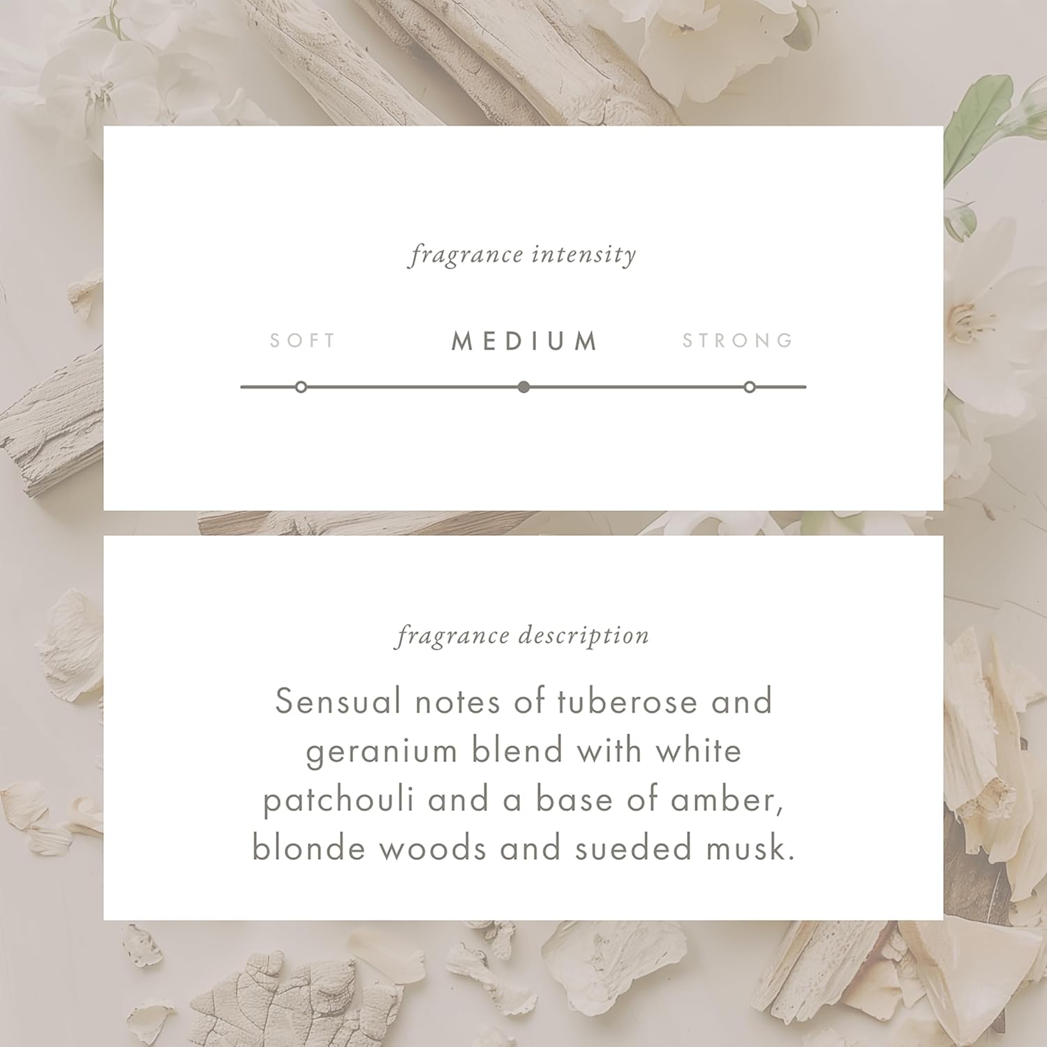 • SMELLS LIKE: Sensual notes of tuberose and geranium blend with white patchouli and a base of amber, blonde woods and sueded musk.