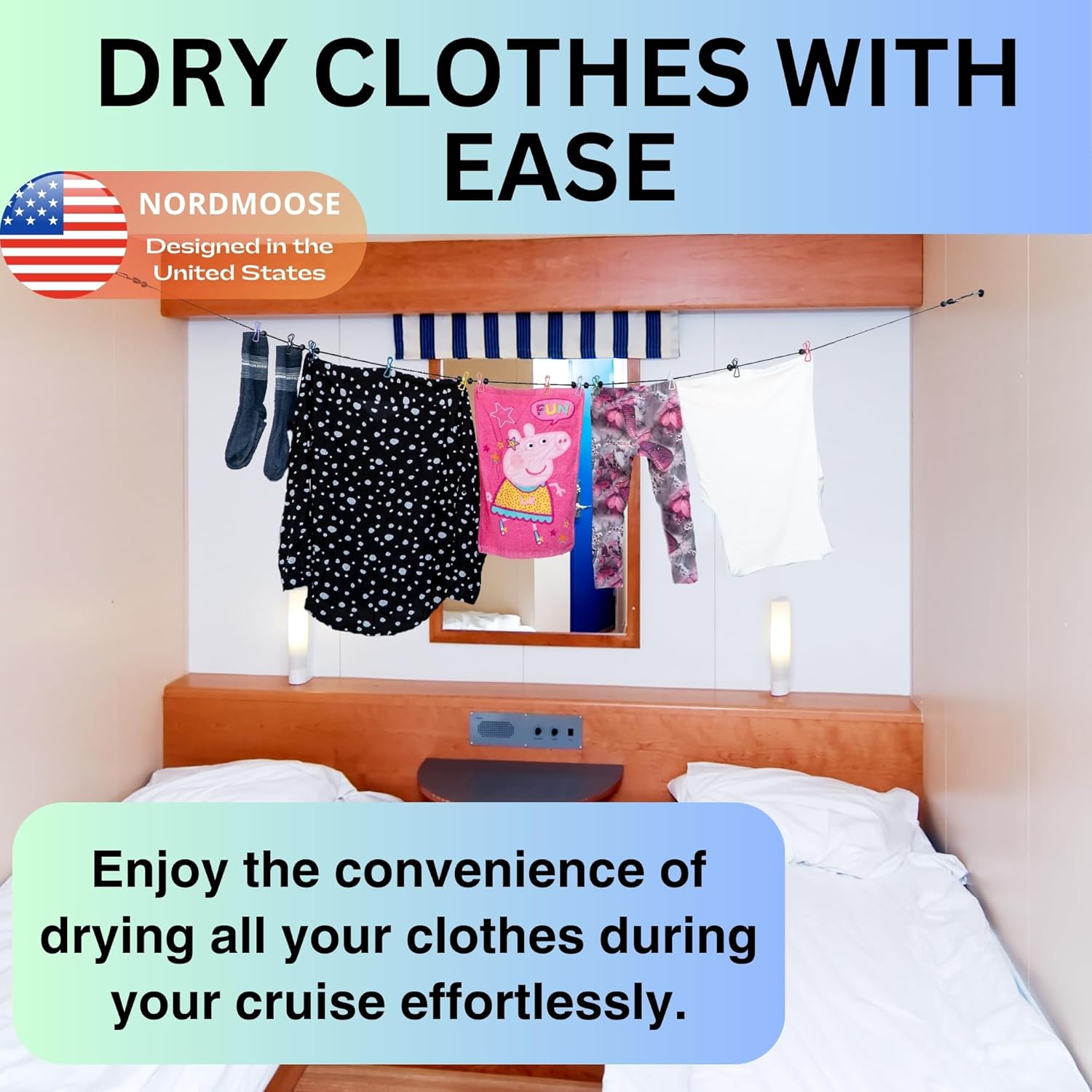 • PORTABLE CLOTHESLINE IS EASY TO USE: Our cruise clothesline is lightweight and comes with a bag for easy carrying on your trips. Simply attach magnets to metal panels, then connect the hooks of the retractable clothesline. It's also perfect to use as RV clothesline.