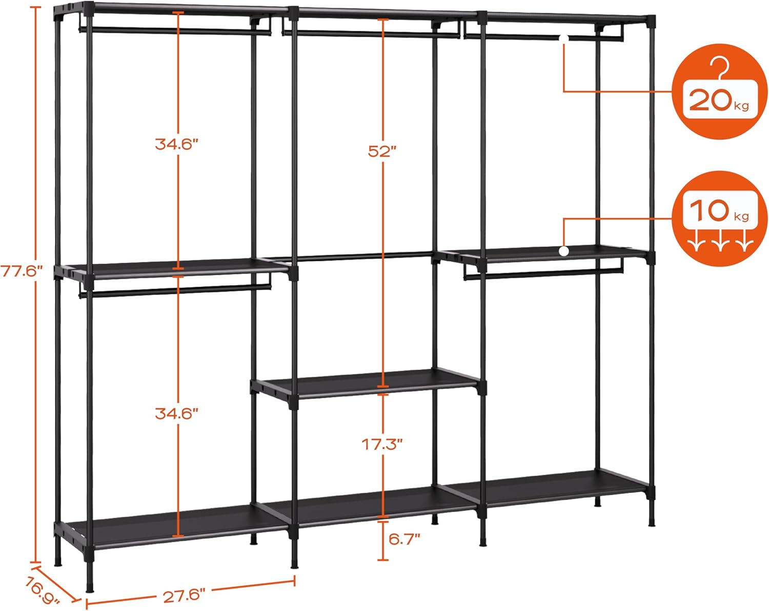 • [Stable and Strong] Featuring with steel tubing, high quality non-woven fabric and durable connectors, this wardrobe ensures long-lasting stability and support. Each hanging rod holds 44 lb and Each shelf holds up to 22 lb.