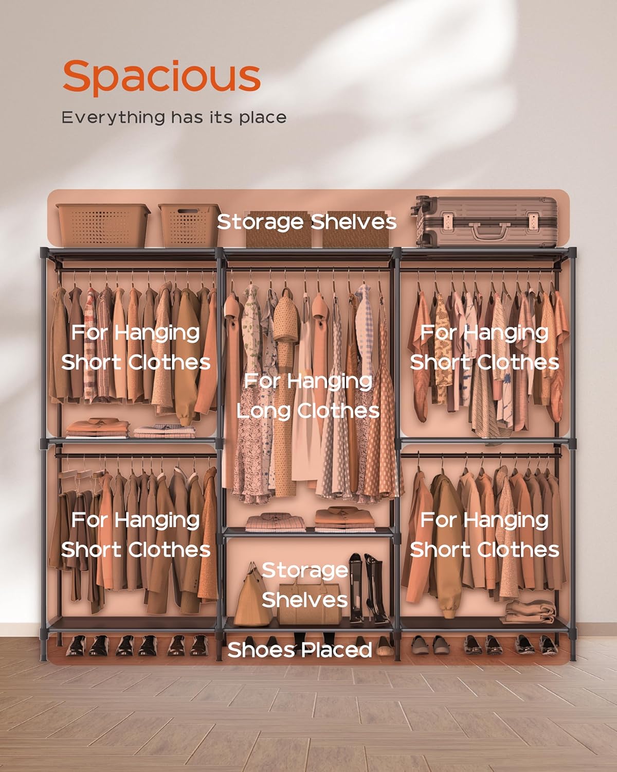 • [Versatile Storage Areas] This closet has 4 areas for hanging short clothes and 1 area for hanging long clothes, as well as multiple shelves for folded clothes. The top area of the wardrobe can holds storage boxes, bags and other items, and the space under the bottom shelf for shoes; maximize your storage needs.
