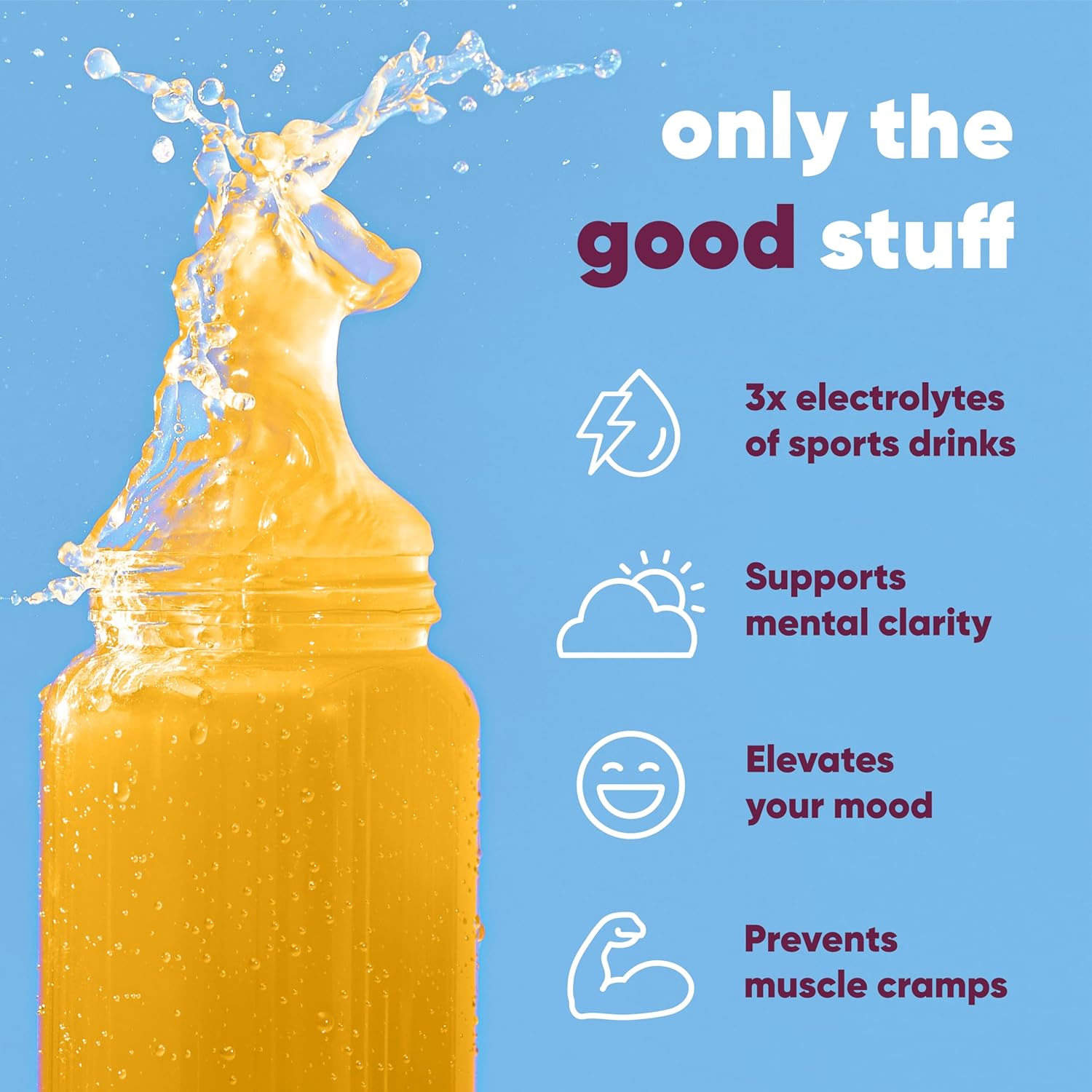 • Product Benefits : Everyday Hydration; Supports Mental Clarity, Focus, and Mood; Prevents Muscle Cramps; Pre and Post Workout; Relieves Dehydration Everyday Hydration; Supports Mental Clarity, Focus, and Mood; Prevents Muscle Cramps; Pre and Post Workout; Relieves Dehydration