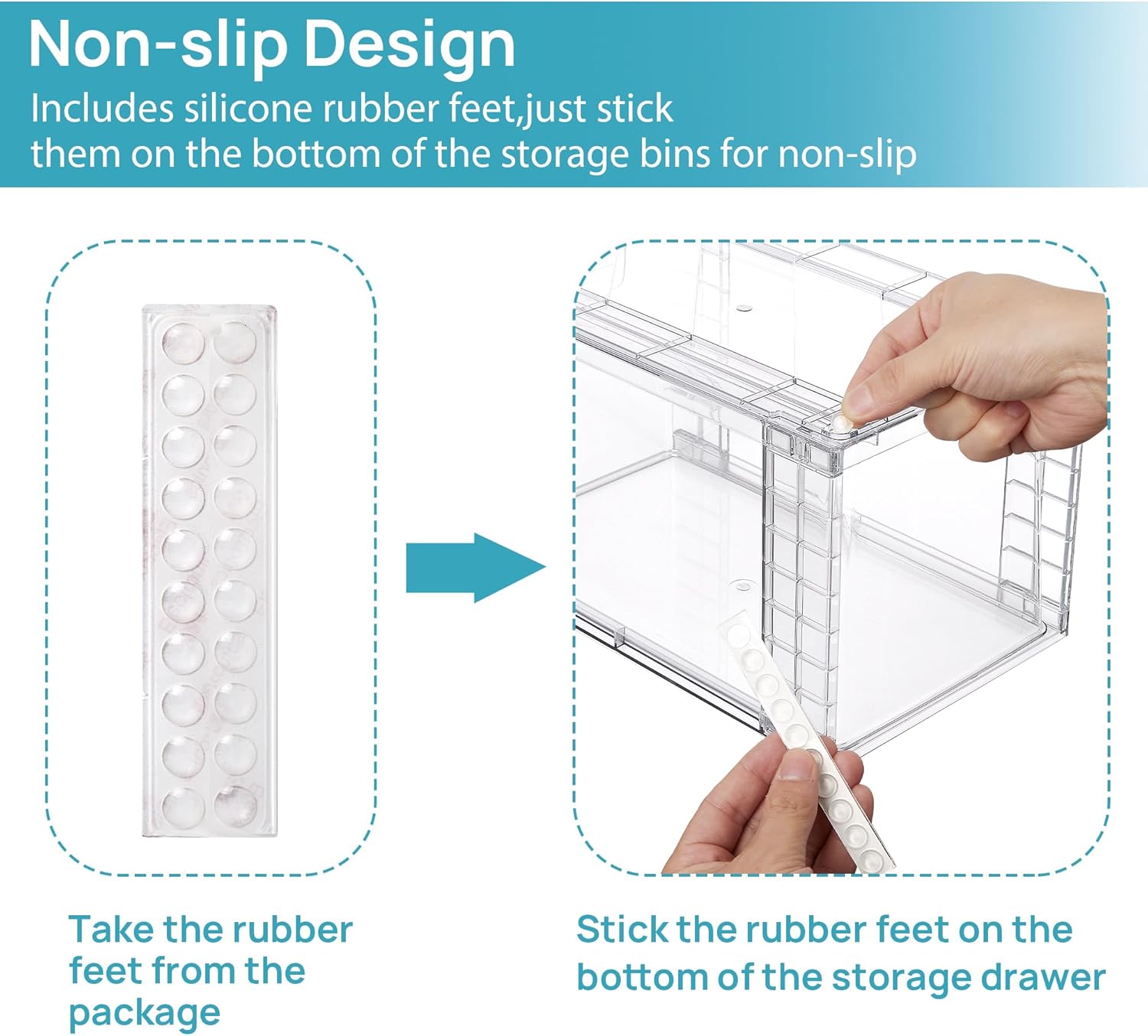 • Built-in Handle and Non-Slip--- Clear organizing containers are designed with pull-out handles, it is convenient to store and take out items.Extra silicone pads are included, add the rubber sticker dots to the bottom,our storage drawers slides in and out very effortlessly and outer frame don't move when pulled out the drawers