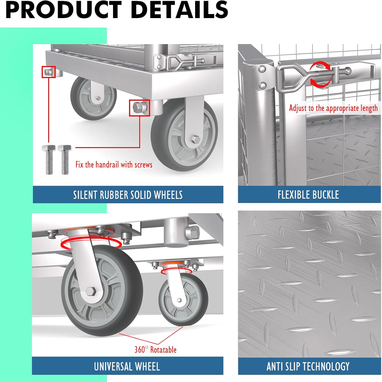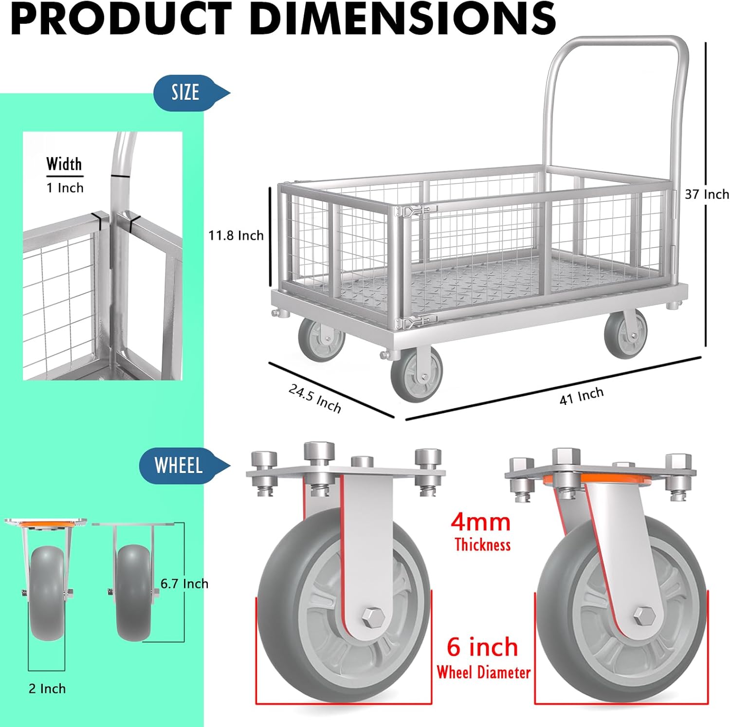 4-in-1 Platform Truck Cart with Cage, Multi-Purpose Heavy Duty Steel Flatbed Cart with 2200lbs Capacity Platform Hand Truck 6" Wheels Push Cart Dolly for Groceries, Garage, Warehouse (41“L x 24" W)