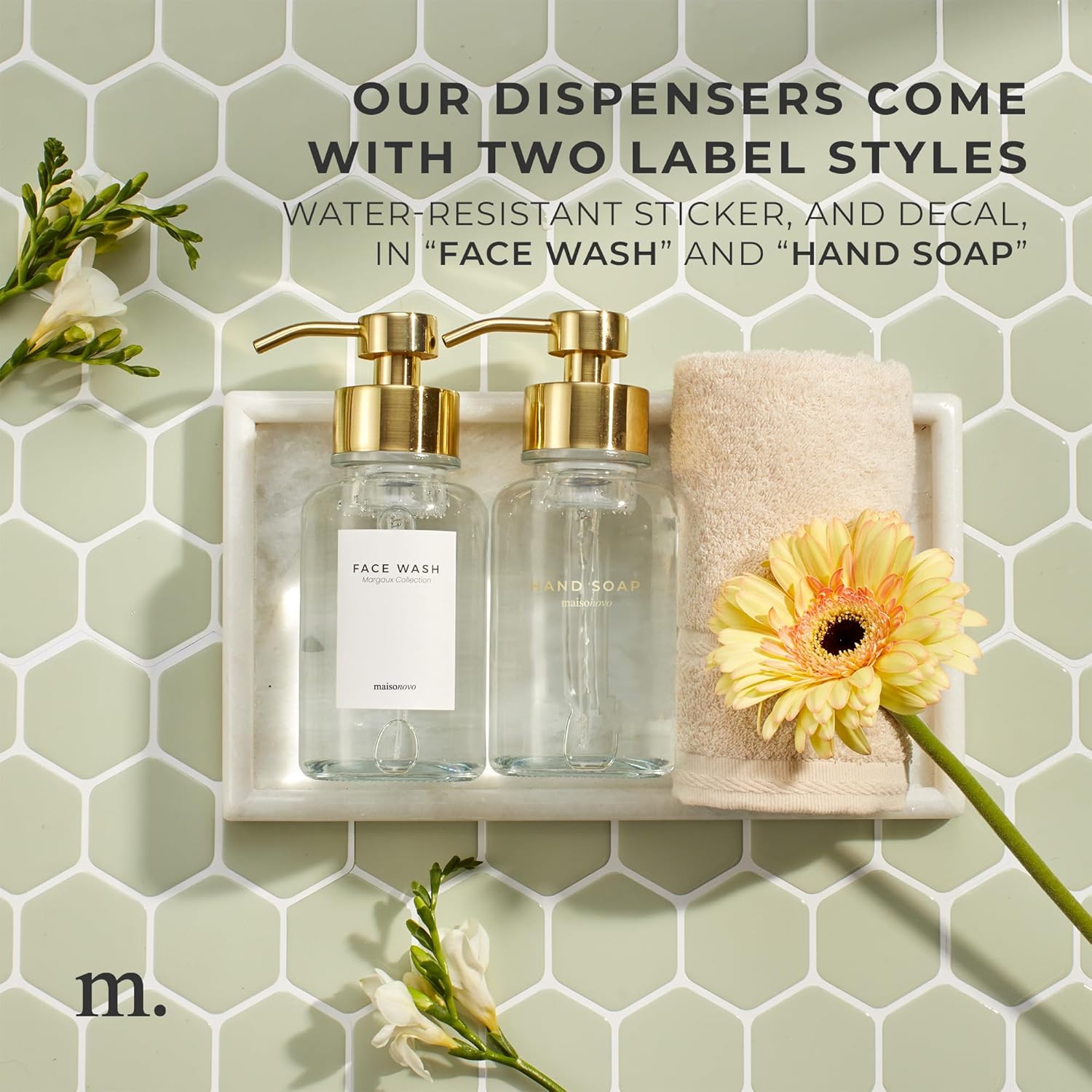 MaisoNovo Glass Foaming Hand Soap Dispenser 14 Oz | Gold Foaming Soap Dispenser Clear Bottle Gold Pump x 1 w/Labels