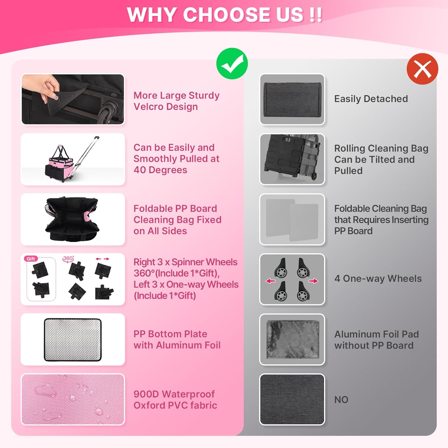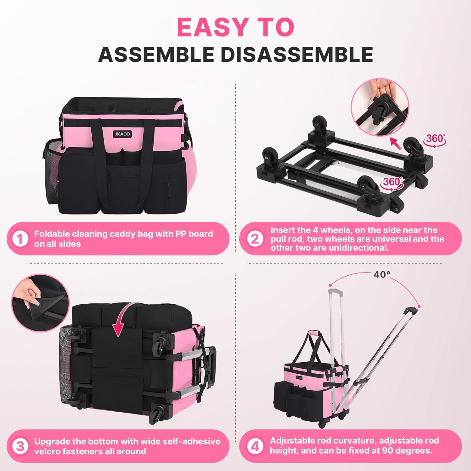 • 【90 °& 40 ° Adjustable Rolling Cleaning Caddy Bag】Rolling cleaning bag comes with 1 detachable shoulder strap and fixed double handles, both padded, it also comes with a detachable cart with 4 detachable inserted wheels (2 spinner wheels 360 °, 2 one-way wheels), and 2 extra wheels for later replacement. A 90 °& 40 ° adjustable pull bar is more agile than a traditional trolley and provides a more portable service