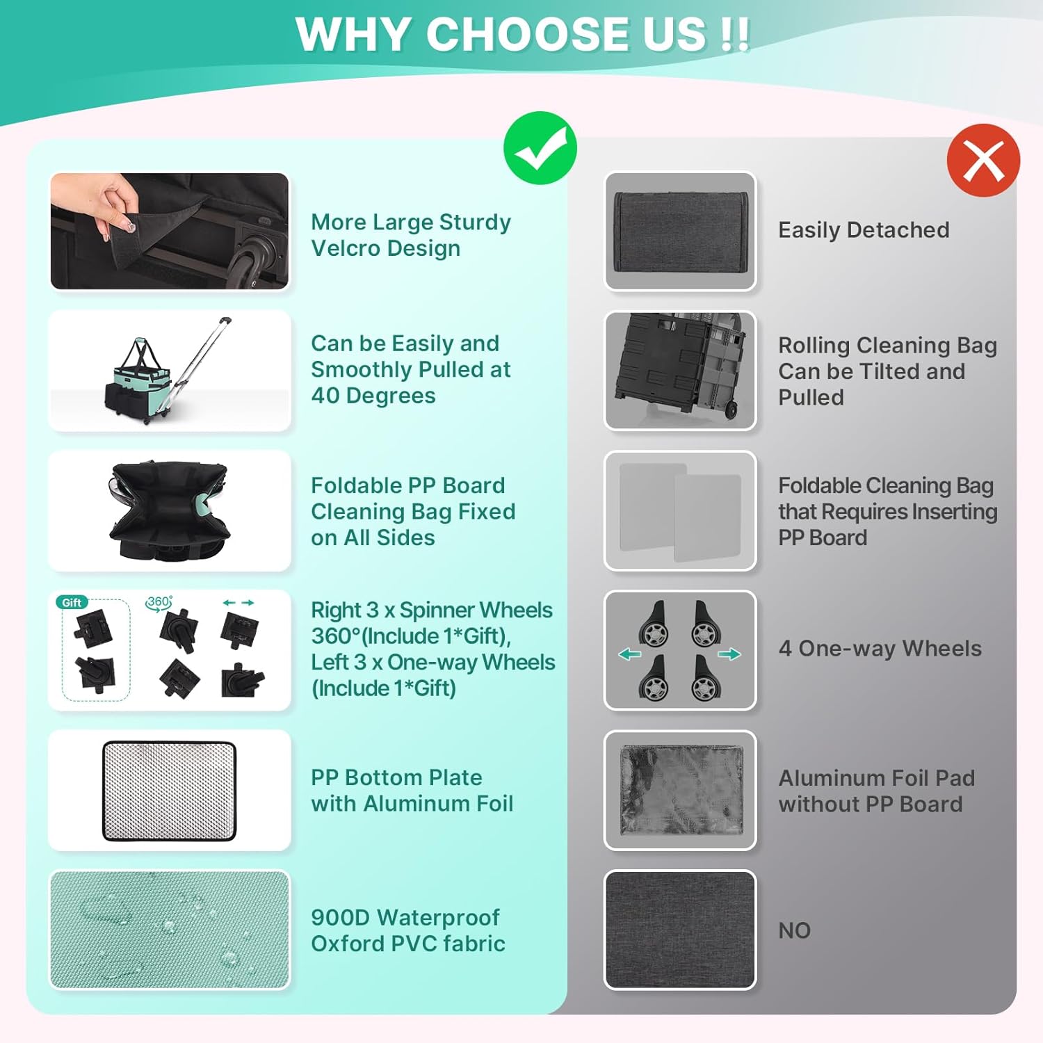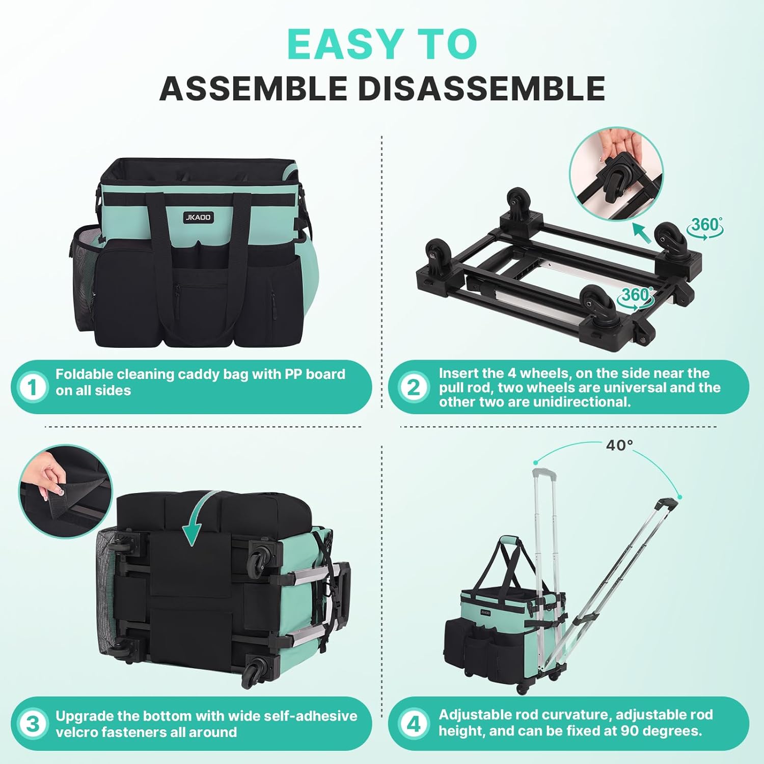 • 【90 °& 40 ° Adjustable Rolling Cleaning Caddy Bag】Rolling cleaning bag comes with 1 detachable shoulder strap and fixed double handles, both padded, it also comes with a detachable cart with 4 detachable inserted wheels (2 spinner wheels 360 °, 2 one-way wheels), and 2 extra wheels for later replacement. A 90 °& 40 ° adjustable pull bar is more agile than a traditional trolley and provides a more portable service