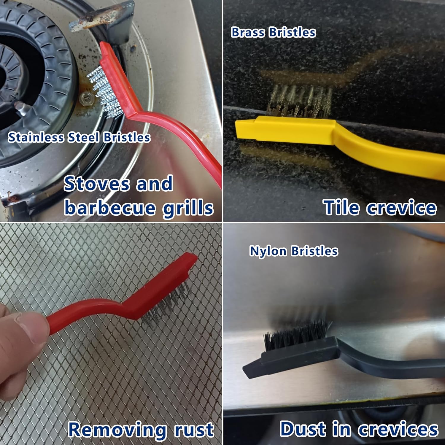 • Three colored brushes provide different cleaning strengths (brass>stainless steel>nylon), and stainless steel brushes are your preferred choice for removing dirt and corrosion. A brass brush can effectively remove stubborn stains, gas stoves, and pot bottoms. Nylon brushes are an ideal choice for detailed surfaces. Very suitable for cleaning stains in small crevices. The brush head adopts a scraper design, which can effectively remove stubborn stains.