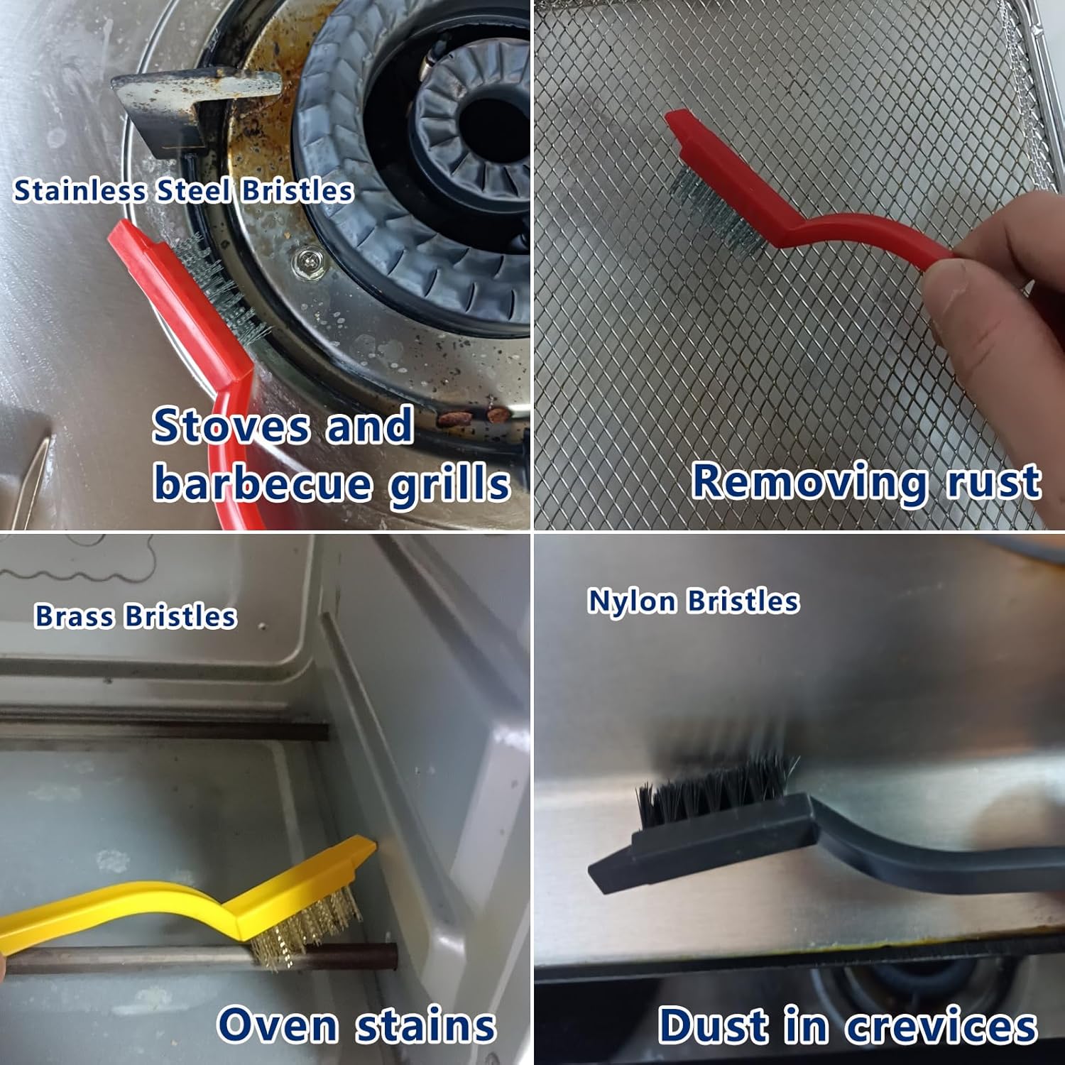 • 【 Three color cleaning brush 】3 different brushes, different materials, providing different cleaning strengths (stainless steel>brass>nylon) to meet various cleaning needs. Stainless steel brushes are perfect for removing rust, grease, and old stains. Brass brushes can effectively solve stubborn stains, gas stoves, and pot bottoms. The nylon brush uses soft bristles, which are very suitable for cleaning dust in small gaps. The brush head adopts a scraper design, effectively removing stubborn stains.