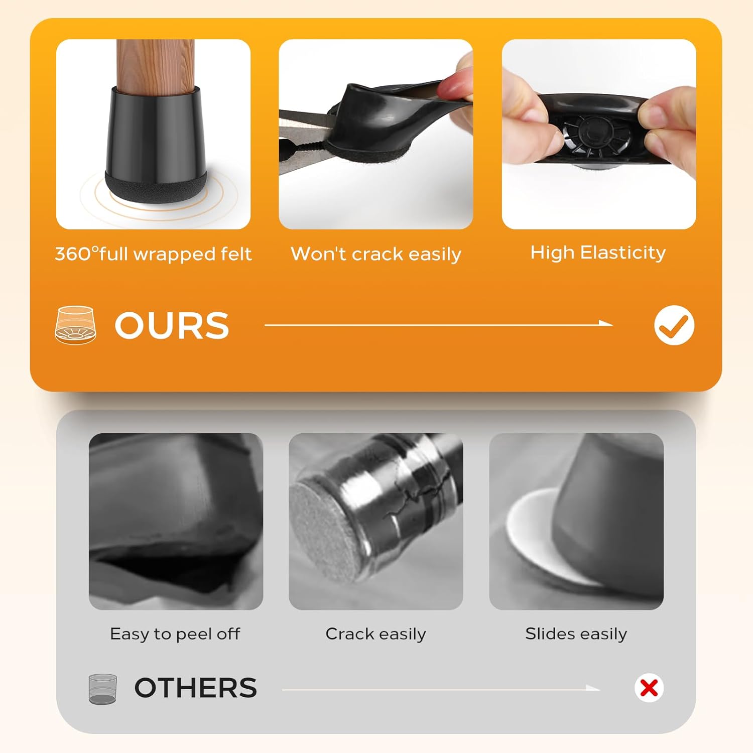 • Enhanced Felt & Wear Resistance- With a 360° fully enveloping felt bottom design and heightened felt thickness, engineered to accommodate various angles of slanted chair legs. Our chair leg floor protectors have a stretch, and elasticity which can maintain longer usage time.