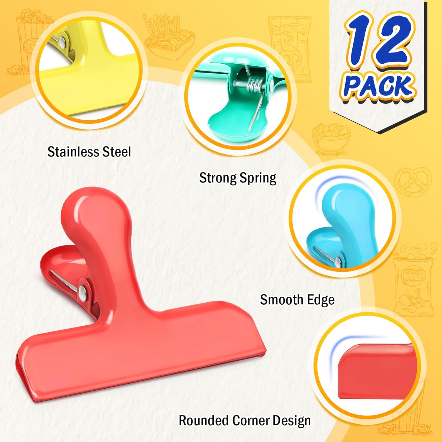 VNDUEEY 12 Pack Stainless Steel Chip Bag Clips, Chip Clips for Food Bags, Heavy Duty Metal Clip for Kitchen and Office to Seal Coffee Bags, Paper Sheets, Air Tight Seal-3 Inches, Multicolor