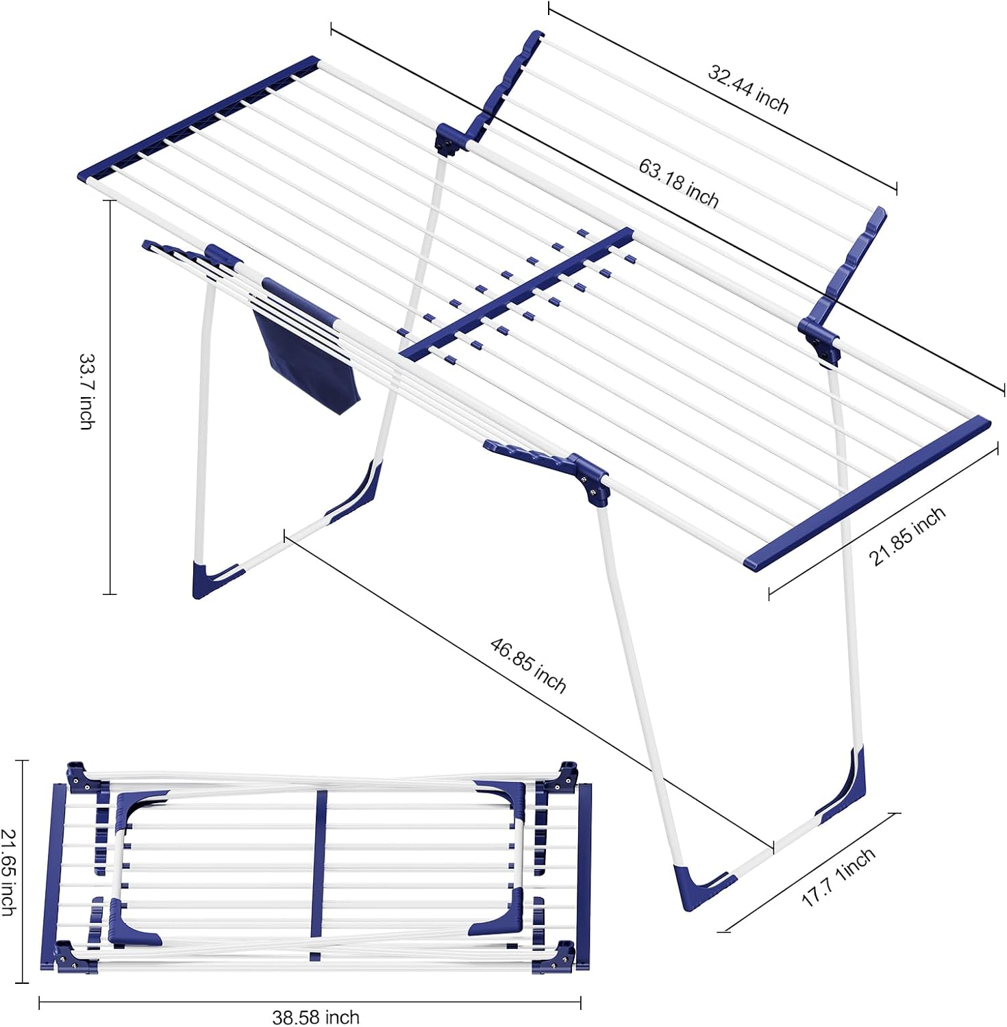 • Maximize Drying Space: The APEXCHASER clothes drying rack offers a generous drying space, measuring 63.2x21.85x33.7 inches, with 24 hanging rods, 10 clips, and 1 clip bag. The 2.4 inch spacing between rods gives efficient drying and accommodates all kinds of clothes easily.