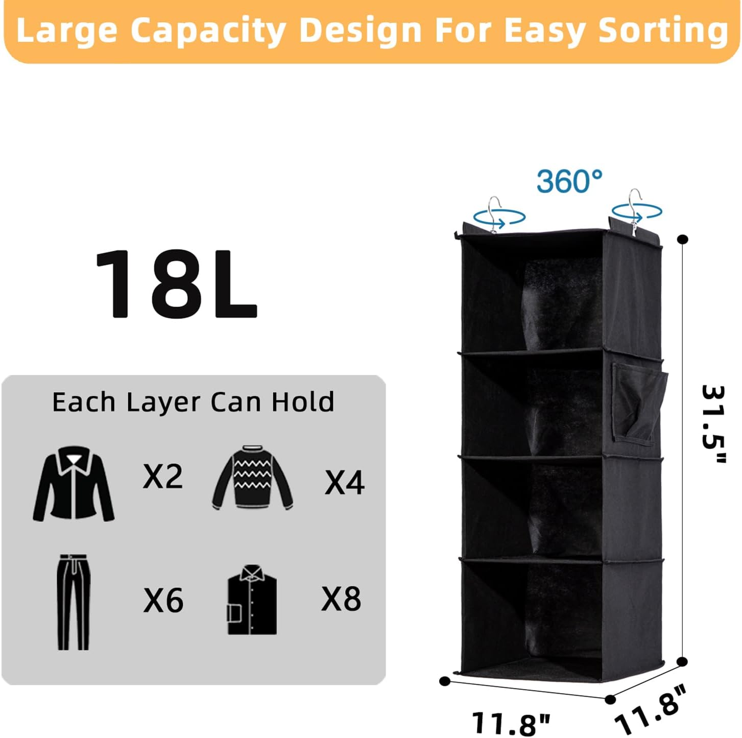 2 Packs Hanging Closet Organizer, 4-Shelf Closet Organizers and Storage with Side Pockets, Collapsible Hanging Shelves for Closet & RV & College Dorm,Black