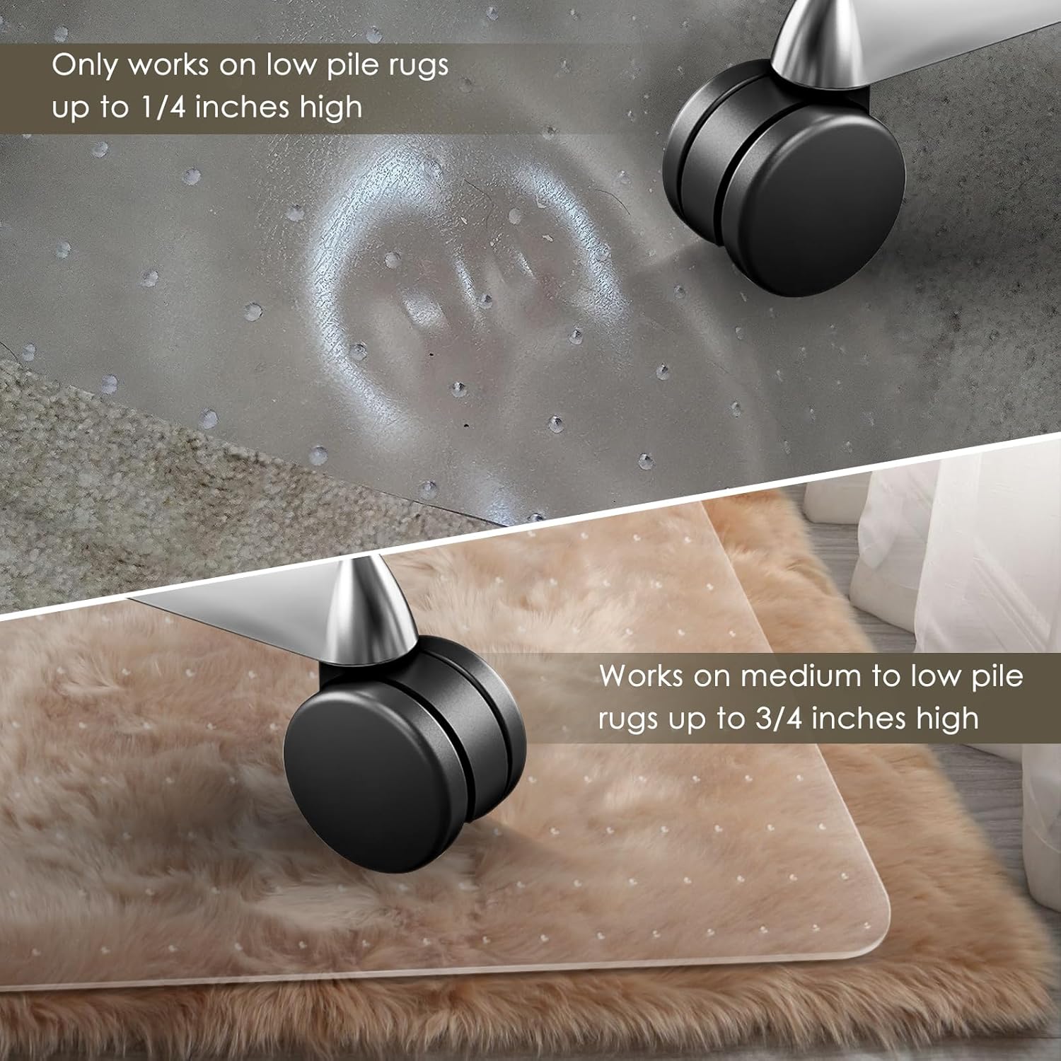 • 【Move Chairs Easily on the Carpet】The office chair mat for carpet is designed to allow people to move their chairs easily even on carpet, reducing back pressure, while protecting your carpet from damage. The unique light texture of the surface allows you to slide on the floor mat very simply to enhance your office experience, with spikes type dots on the back to securely fasten to most carpets.