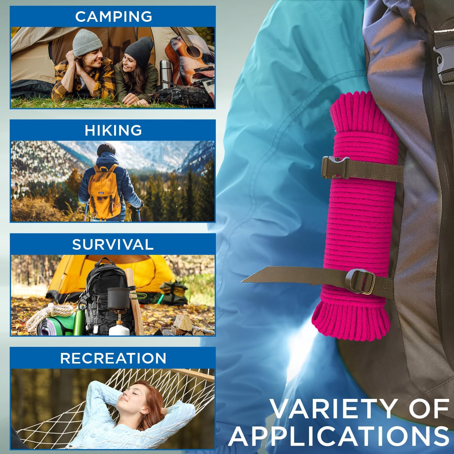TECEUM Cotton Rope 3/16” (5 mm) – 100 FT – Strong All-Purpose Braided Rope – Natural Cotton – for Crafting, Сamping, Clothes Line, DIY, Indoor & Outdoor Use – Bright Pink