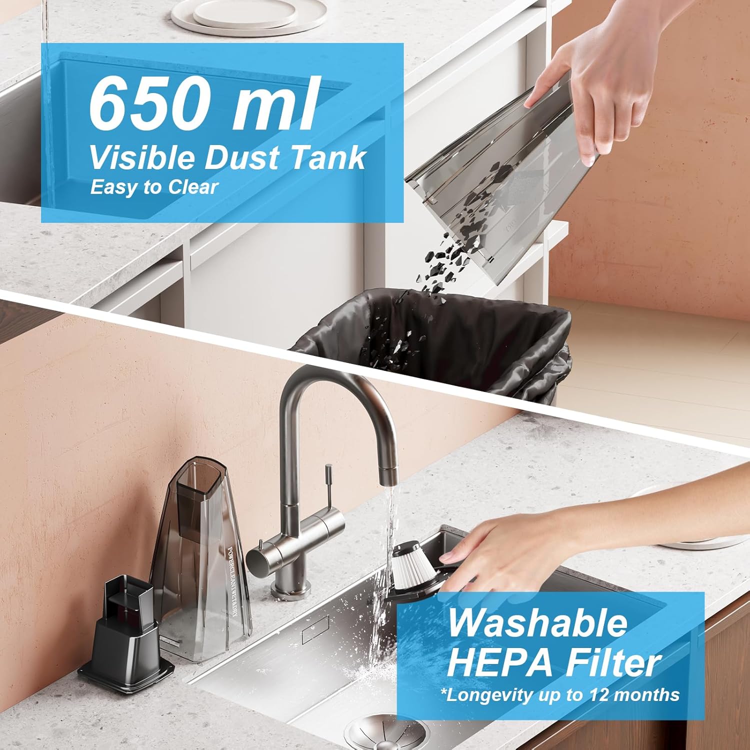• Large Dust Bin + Washable HEPA Filter - The 650 ml large dust collection box can hold more dust and can be easily emptied with just a press of a button. Cordless handheld vacuum has a three-layer HEPA filtration system that can remove up to 99.99% of dust particles. It has a longer service life than traditional filters and can remove dust with clean water