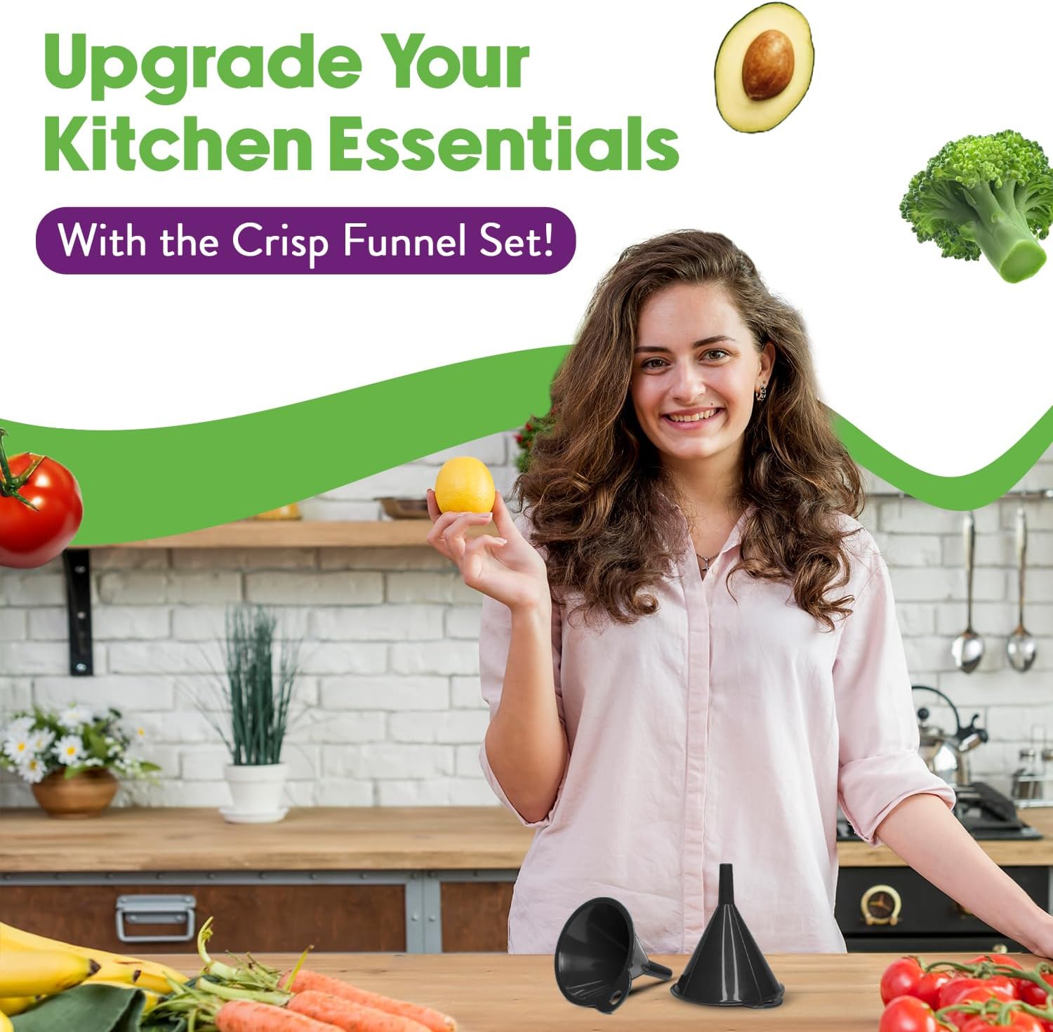 Crisp 2-Piece Funnel Set - All Purpose Funnels for Kitchen Use Filling Bottles - Durable & Dishwasher Safe Kitchen Funnel Set - Made in The USA - Black