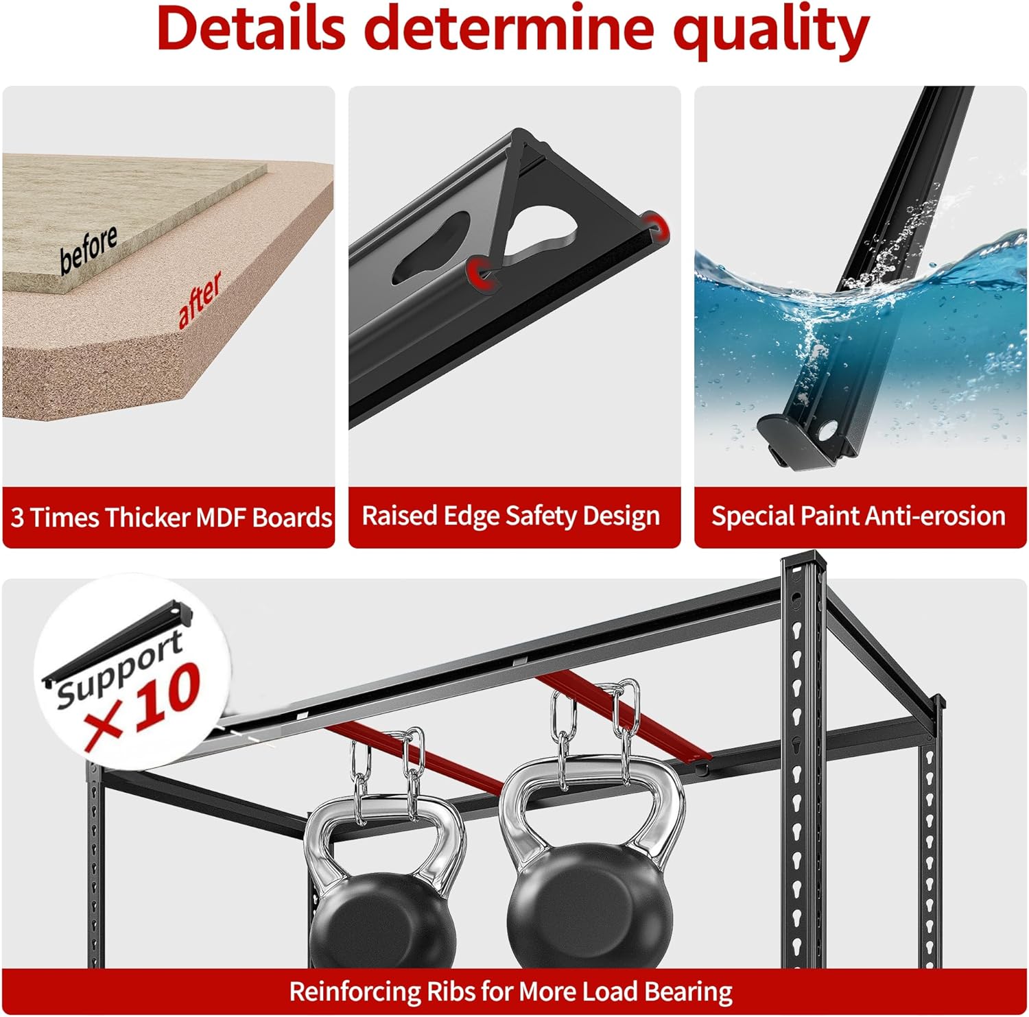 • 【3000LBS Capacity & 10 Support Ribs Garage Shelving】Garage shelving is made of heavy duty metal. The shelving unit has 2 support rods under each layer of MDF for this storage shelves, which can further increase the load bearing to meet ur needs for placing heavy objects. The thickened single-layer load-bearing capacity 600LBS and the total load-bearing capacity of 3000LBS. It is suitable for garage, workplaces, living room, kitchen, to store camping equipment, tools, kitchen supplies