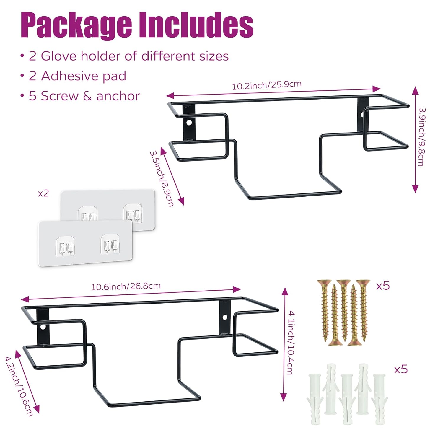 • What Will You Receive:2 glove holders, one large and one small in size. 2 adhesive pads, 5 screws and anchors. The large one can hold boxes measuring 10.28"L*3.78"W or smaller, and the small one can hold 9.8"L*3.1"W or smaller.