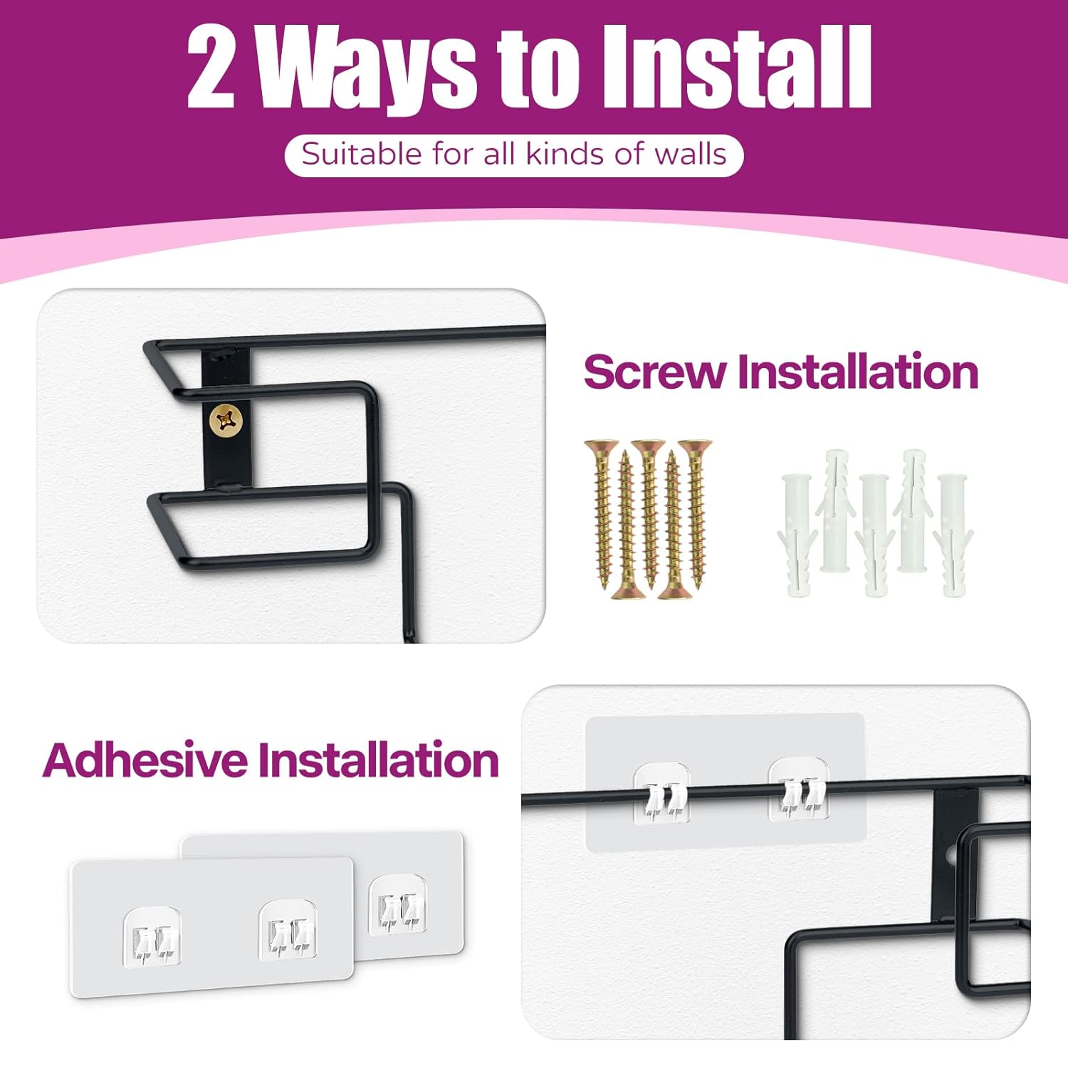 • Two Mounting Options:The glove rack comes with all the necessary hardware for installation, and it can be mounted on the wall or cabinet door using either adhesive hooks or screws, allowing you to choose the installation method based on your wall conditions.