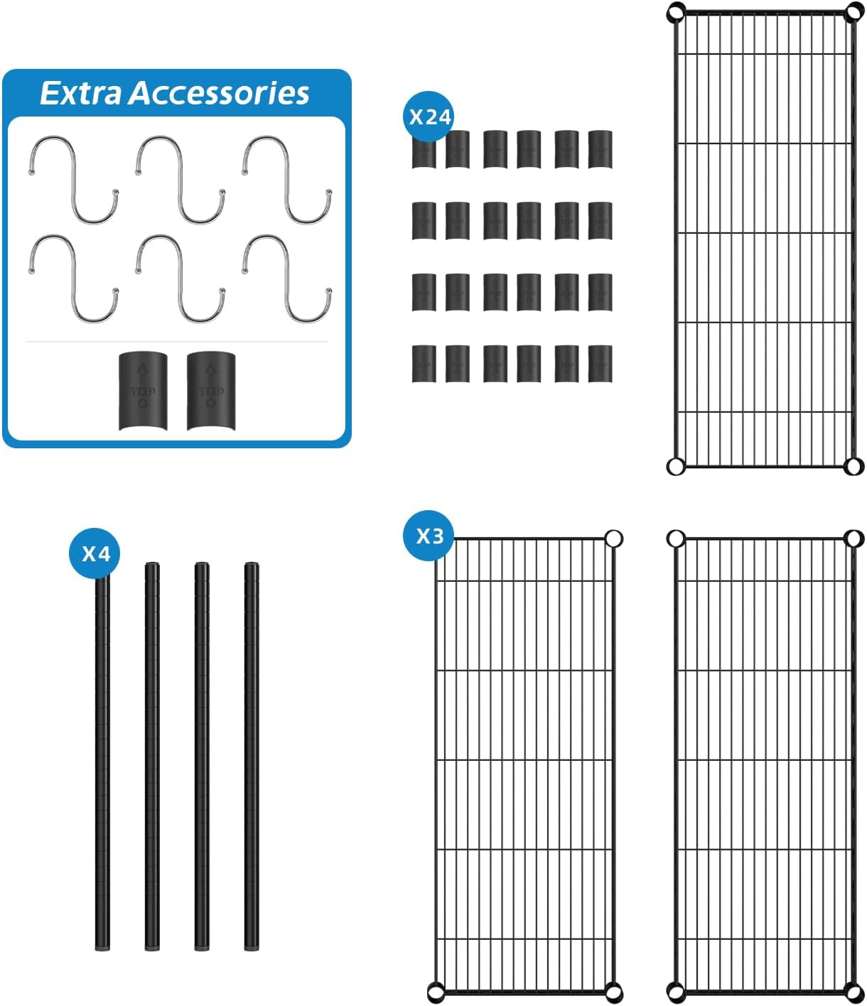 • What You Will Get:This Wire Shelving include: 3 pieces of metal mesh, 4 uprights, 24 clips; an additional 2 clips and 6 metal hooks are included