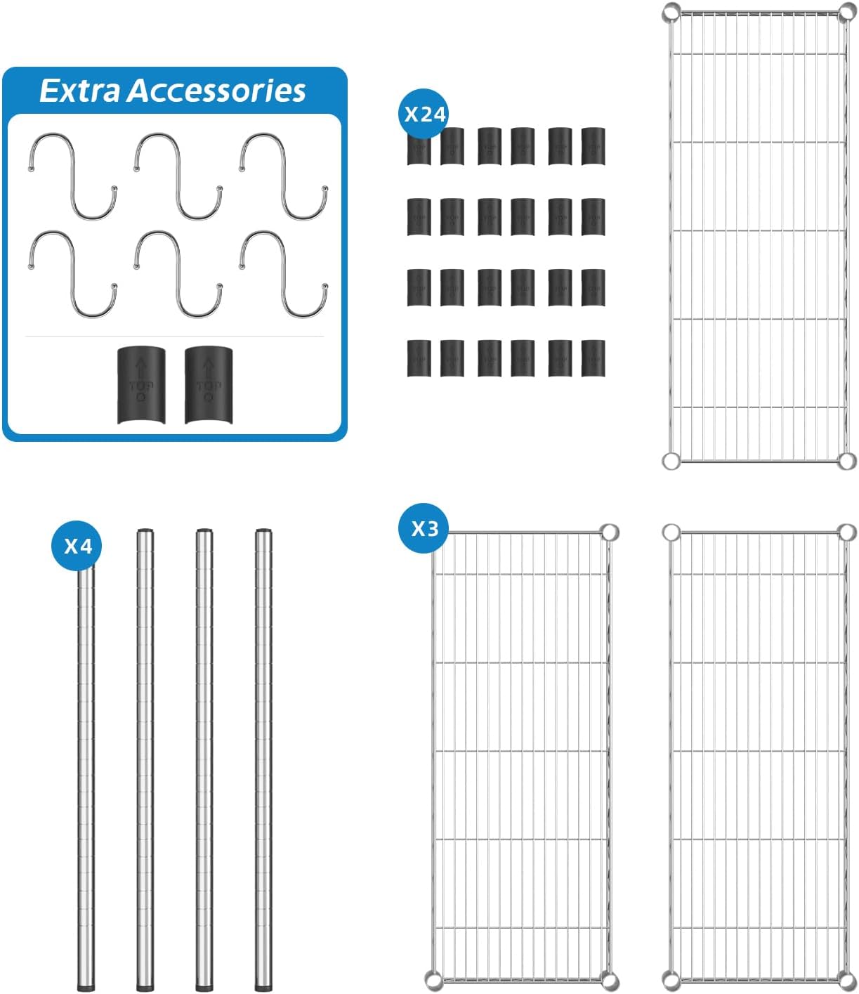 • What You Will Get: This Wire Shelving include: 3 pieces of Metal Mesh Board, 4 pcs Pole, 24 pcs Clips; Additionally, an additional 2 clips and 6 metal hooks are included