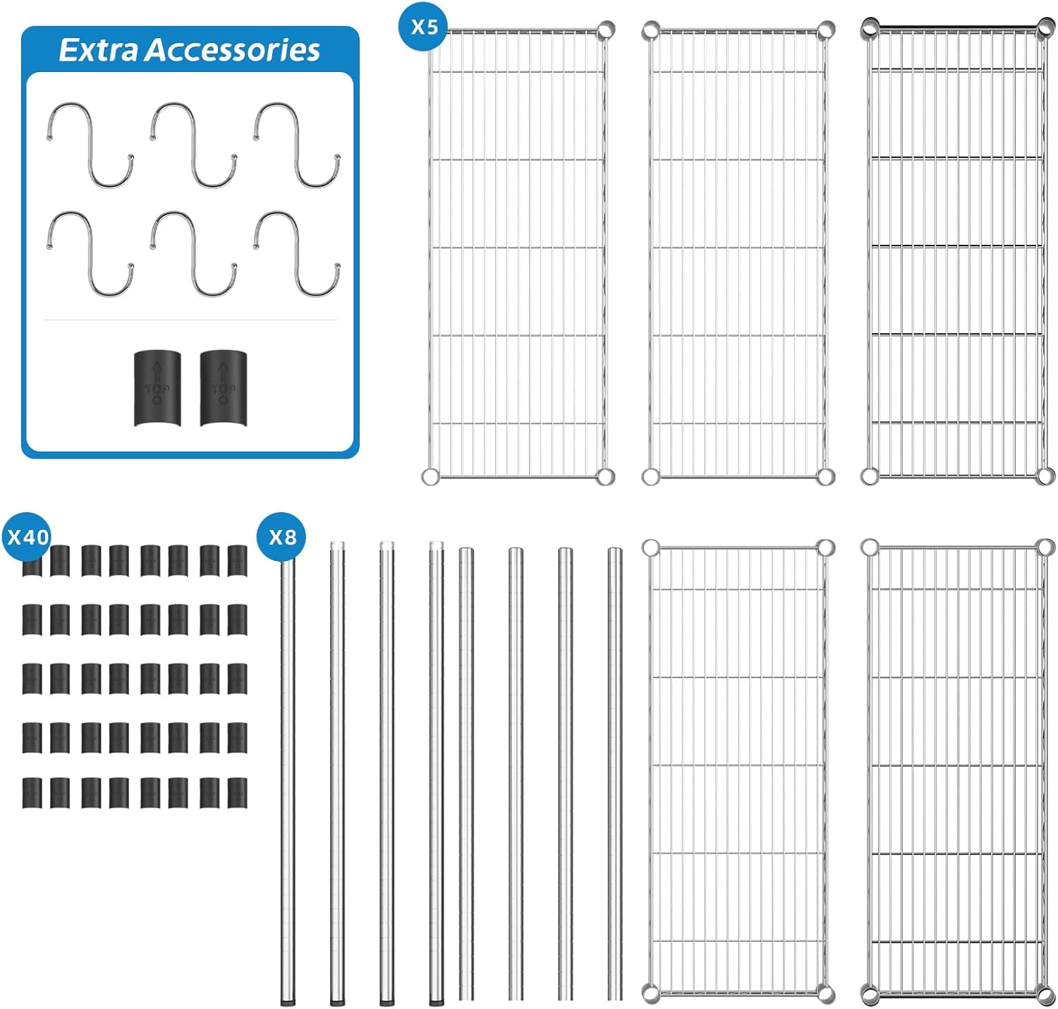 • What You Will Get: This Wire Shelving include: 5 pieces of Metal Mesh Board, 4 pcs Upper Pole,4 pcs Bottom Pole, 40 pcs Clips; Additionally, an additional 2 clips and 6 metal hooks are included