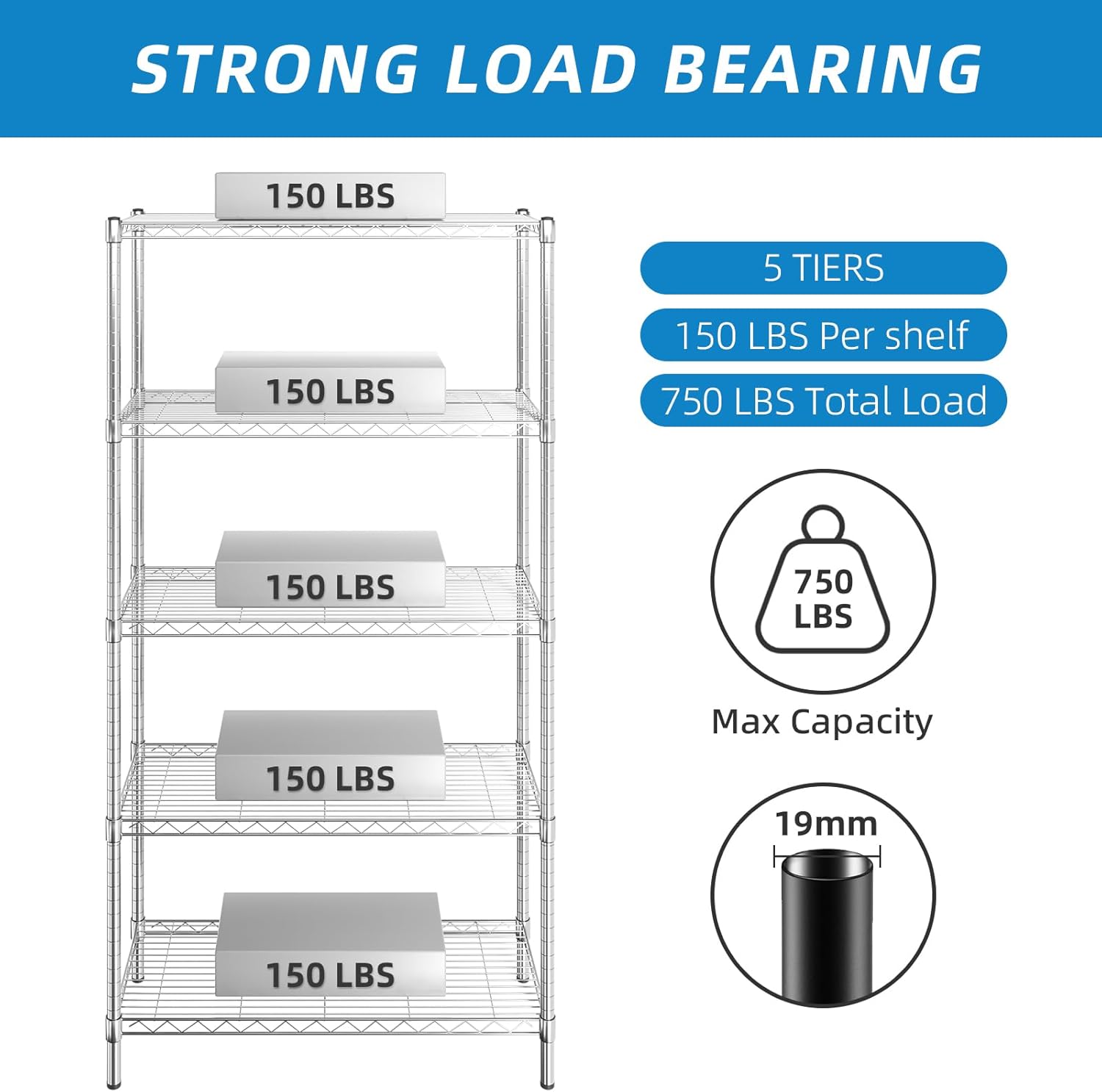 5-Shelf Adjustable Metal Shelf Wire Shelving Unit Storage Rack Display Shelf for Office,Kitchen,Bedroom,Bathroom,Laundry,Pantry Basement,Garage(Chrome,36" L x 14" W x 72" H)